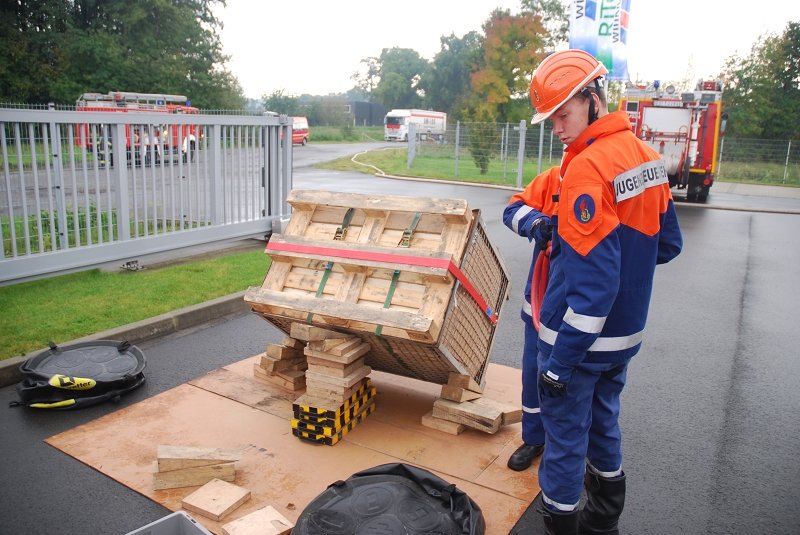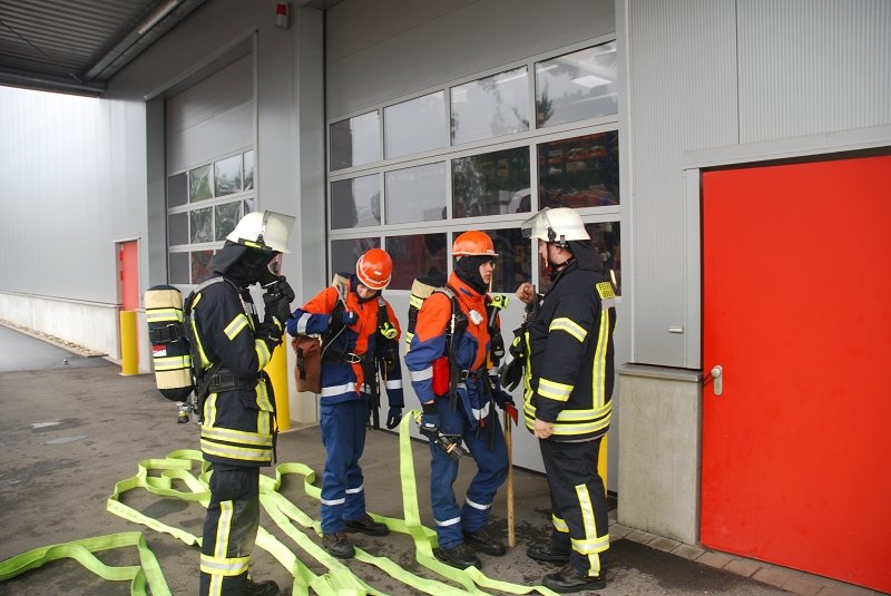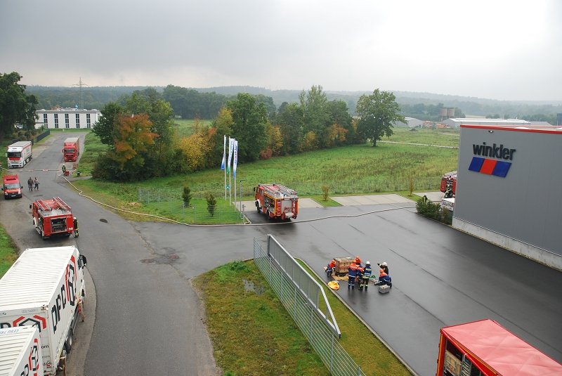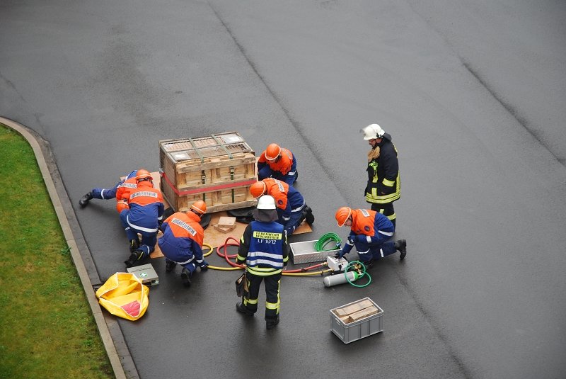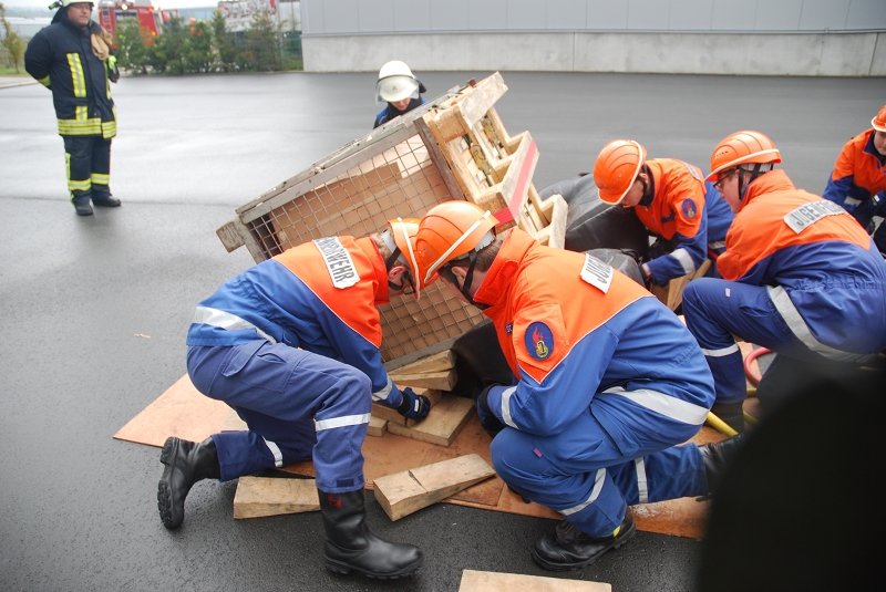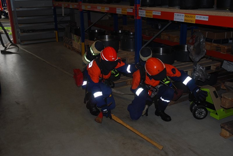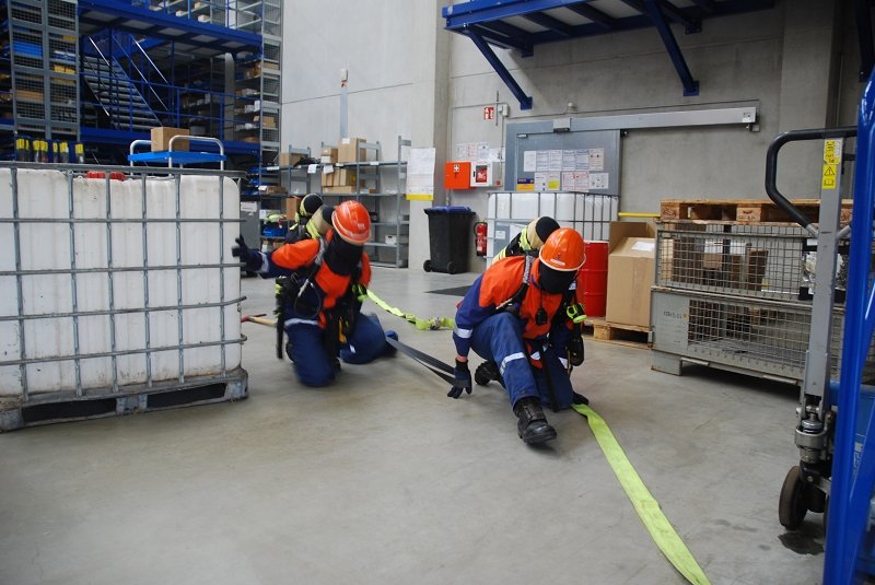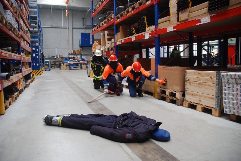 Angenommen Lage war, dass es durch eine Explosion in einer Lagerhalle zu einem Feuer mit Rauchentwicklung gekommen war und mehrere Mitarbeiter der Firma vermisst wurden. Ebenfalls wurde durch die Wucht der Explosion eine Person im freien unter einer schweren Palette eingeklemmt.