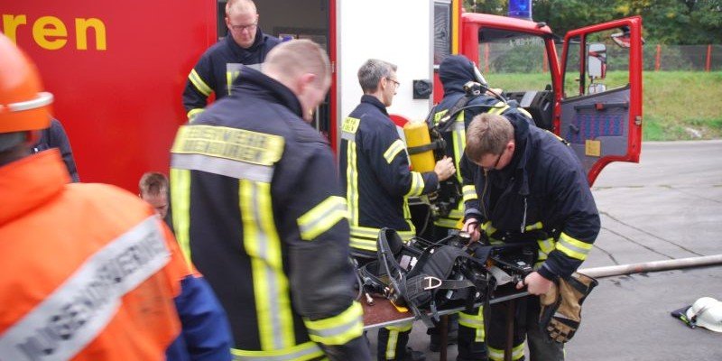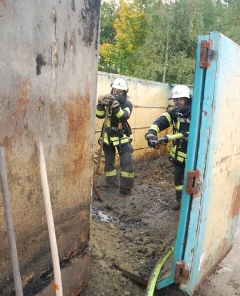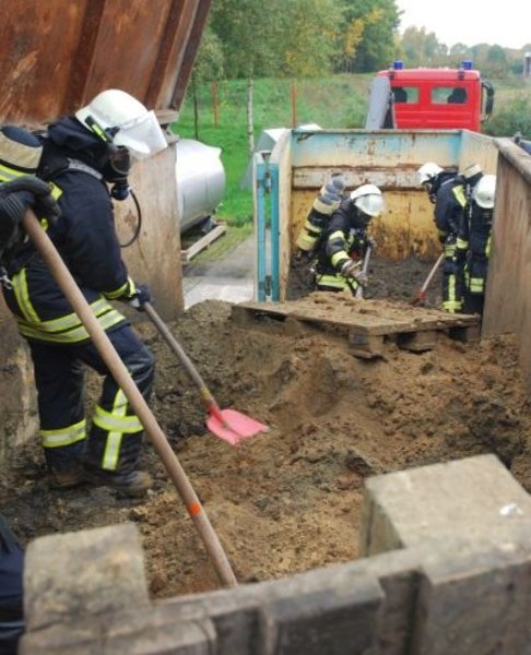 Mehrere Trupps unter umluftunabhängigem Atemschutz schaufelten die glimmende Bleicherde unter Ablöschmaßnahmen in einen leeren Container um.