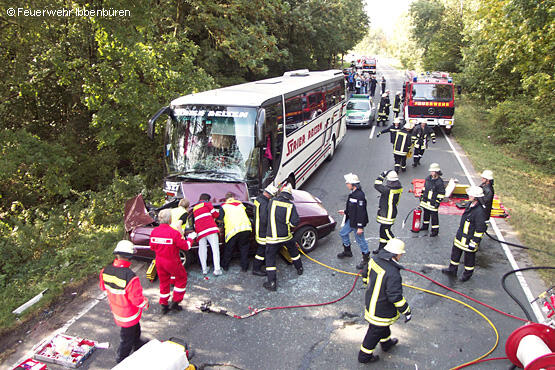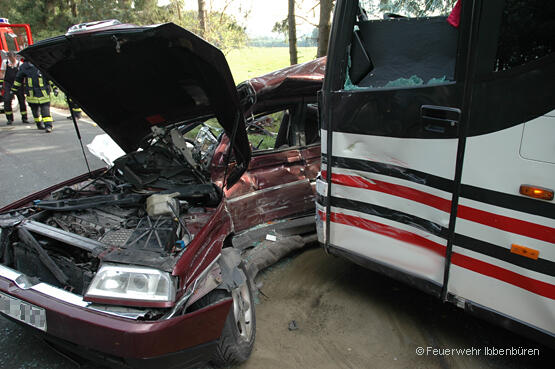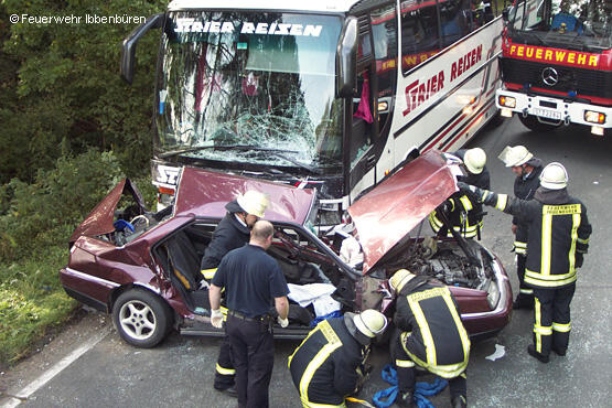 Technische Hilfe: Verkehrsunfall - Pkw gegen Bus, 2 eingeklemmte Personen