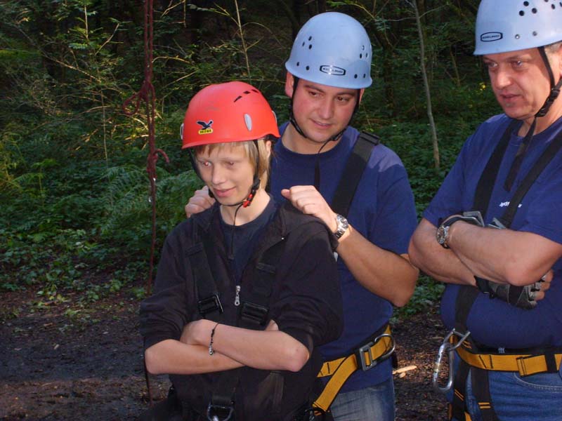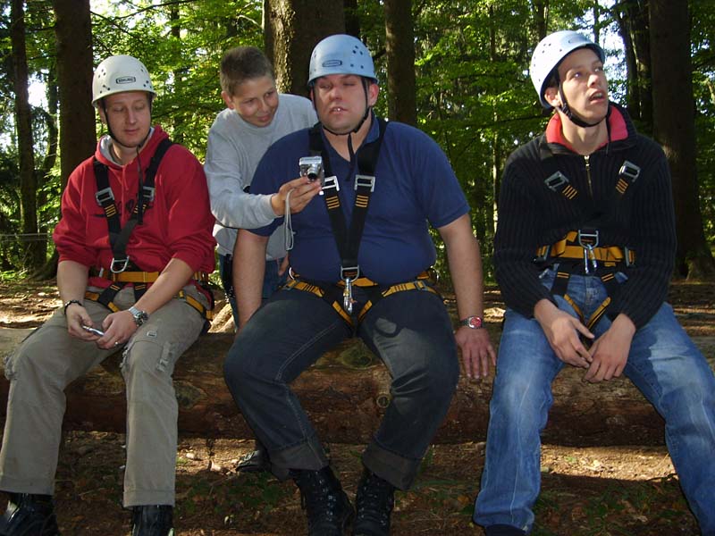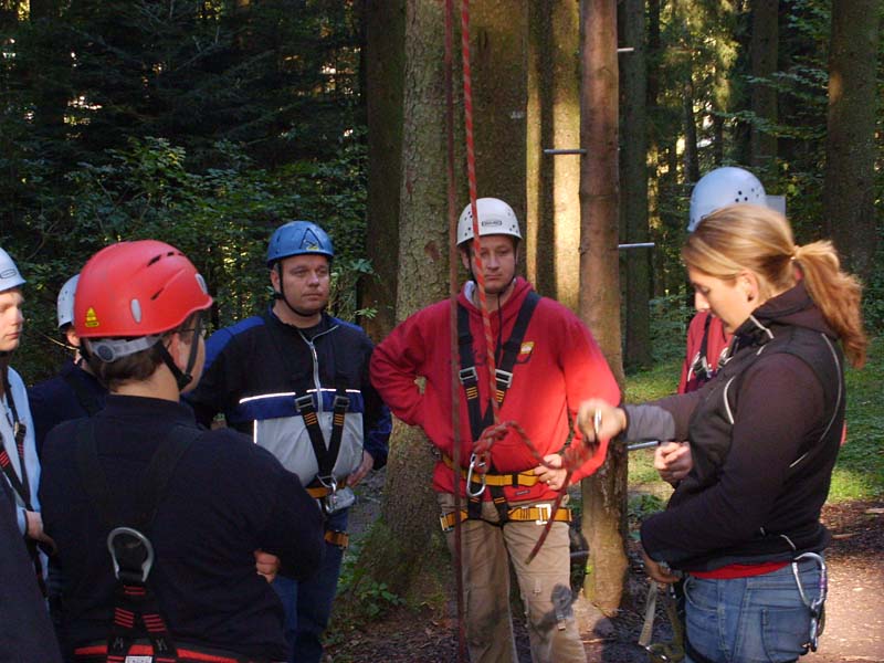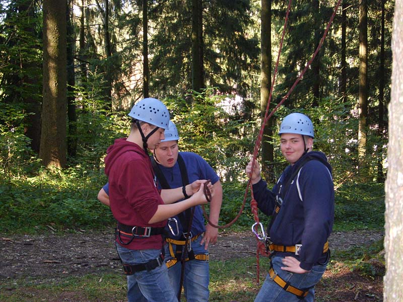 Am Donnerstag war es dann so weit, der Hochseilgarten im nahe gelegenen Isny war an der Reihe. Diverse unterschiedlichste Übungen auf ca. acht Meter hohen Podesten waren zu meistern. Als erstes wurden die Sicherheitsausrüstungen verteilt, erklärt und schon ging es an die allseits beliebte Knotenkunde. In Dreierteams eingeteilt ging es dann an die verschiedenen Übungen. Einer klettert hoch und macht die Übung, die anderen Beiden sichern ihn über ein Seil, acht Meter tiefer. Da musste man schon vollstes Vertrauen zu seinen Kameradinnen und Kameraden aufbringen! Es wurde über Balken gelaufen, durch Netzte gehangelt, über Seile balanciert und so weiter. Eine besondere Herausforderung bestand darin, auf einen freistehenden Masten (8 Meter) zu klettern, sich oben auf zu stellen und dann auch noch wieder runter zu springen. Eine Übung, die auch die härter gesottenen an die eigenen Grenzen führte. Das Gemeinschaftsgefühl allerdings ist in Worten schlecht zu beschreiben und es war toll zu sehen, wie der eine oder andere über sich hinaus wuchs und anschließen den Beifall der anderen Gruppenmitglieder erntete.