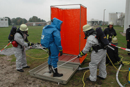 In der Zwischenzeit hatte auch der LZ Dörenthe mit dem Material des bei ihm stationierten DekonP einen Dekontaminationsplatz aufgebaut. Dort konnten alle Personen, die aus dem Gefahrenbereich kamen, von einer möglichen Kontamination befreit werden. Dies geschieht, in dem Schutzanzüge bzw. Kleidungsstücke in einer eigens dafür aufgebauten "Dusche" abgewaschen werden. Das Wasser wird dabei aufgefangen.