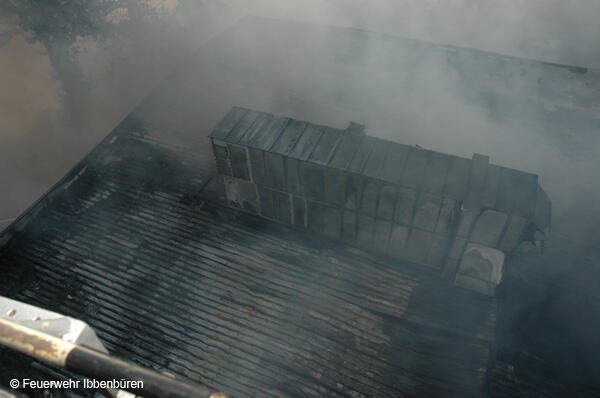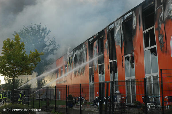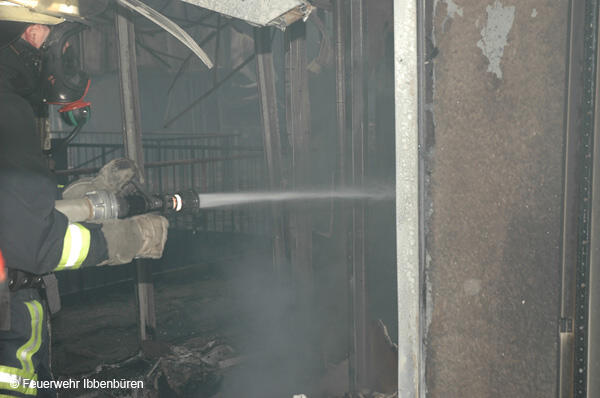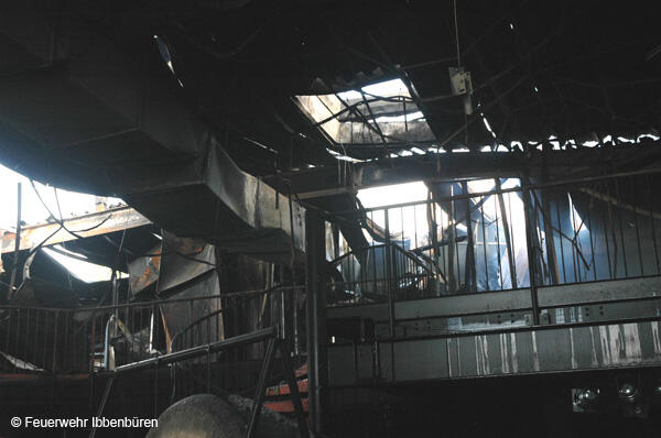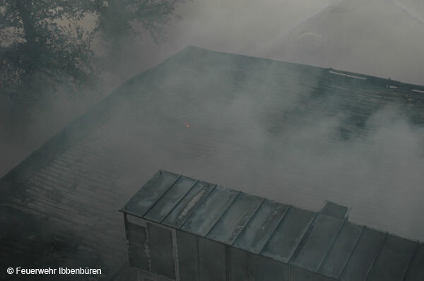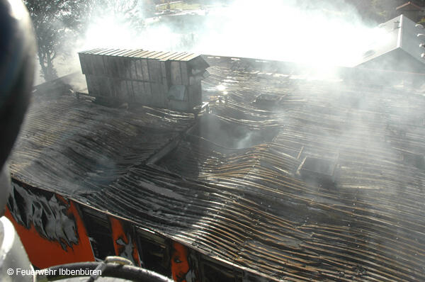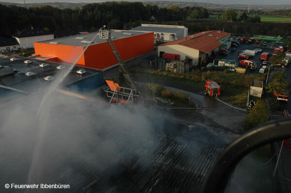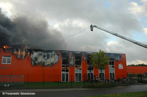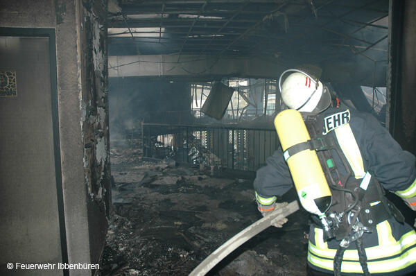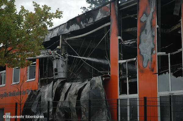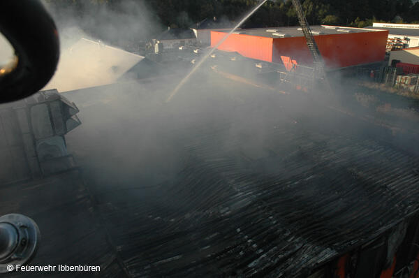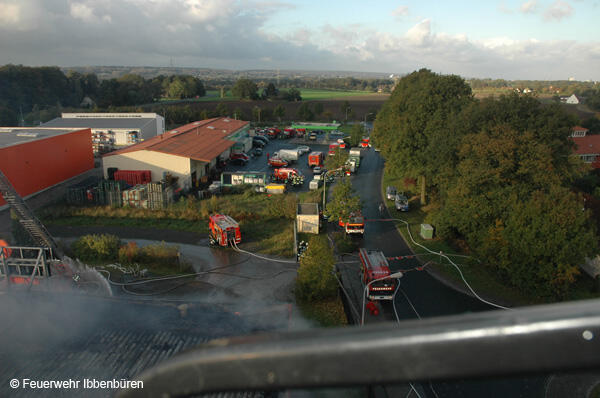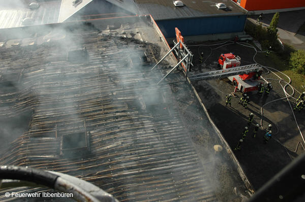Die erste DL wurde zeitgleich in Stellung gebracht. Es wurden Riegelstellungen zu den angrenzenden Gebäudeteilen aufgebaut und mit Unterstützung der insgesamt 3 Drehleitern (Ibbenbüren, Lengerich und Rheine) das Feuer von außen bekämpft.