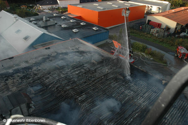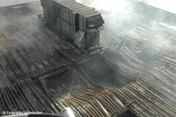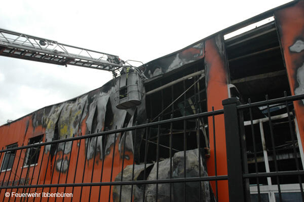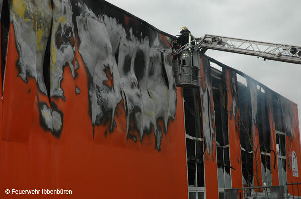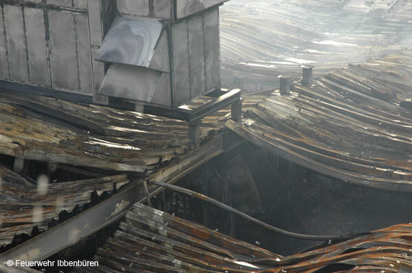 Der Gasanschluss der Halle wurde ebenso wie die elektrische Versorgung abgestellt. Durch die große Hitze im Gebäude hatten sich Stahlträger verbogen und Dachteile waren ins Innere gefallen, weshalb Innenangriffe lange Zeit nicht möglich waren. Deshalb musste im Verlauf des Einsatzes an mehreren Stellen die Außenhaut der Stahlbauhalle geöffnet werden, um Zugänge für die Löscharbeiten zu schaffen. Hierzu wurde mit einer Multicut-Spezialsäge das Blech aufgeschnitten.