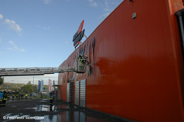 Die ersten Kräfte fanden die etwa 1.200 qm große Ausstellungshalle vollständig verraucht vor. Es schlugen Flammen aus Fenstern, Wänden und kurz darauf auch aus dem Dach. Schnell wurde der Entschluss gefasst keine Trupps mehr in die Halle zu schicken - die Eigengefährdung wäre zu groß gewesen. Ziel war es, ein Übergreifen der Flammen auf die anderen Gebäude der Firma (rund 3.000 qm Verkaufsfläche und 12.000 qm Lager und Logistik) zu verhindern. Dieses Ziel wurde auch erreicht.