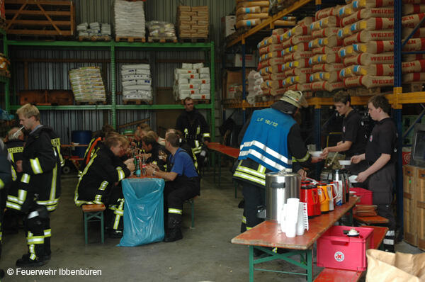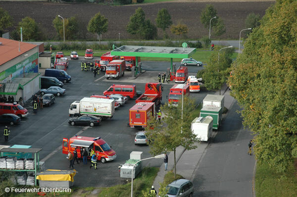 Eine Tankstelle neben der Halle war nicht vom Brand bedroht. Die Entfernung war ausreichend und der Westwind trieb Rauch und Flammen genau in die entgegengesetzte Richtung. Der Betrieb der Tankstelle wurde aber vorsorglich eingestellt. Auf dem Gelände positionierten sich der Führungsstab und die Versorgung. Eine Helferverpflegung wurde durch das DRK sichergestellt.