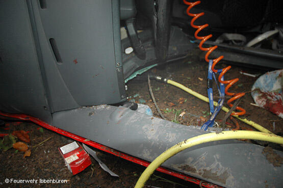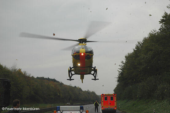 Vom ersten Fahrzeug - dem LF24 - wurde ein pneumatisches Hebekissen eingesetzt. Damit konnte das Führerhaus schnell ein Stück weit angehoben und der Patient befreit werden. Er wurde an der Einsatzstelle vom Notarzt medizinisch betreut und schließlich mit dem RTH ins Klinikum Osnabrück gebracht.