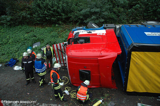 Technische Hilfe: Lkw umgekippt, Fahrer eingeklemmt