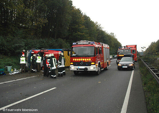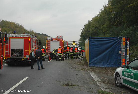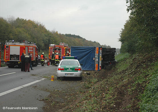 Für den Brandschutz war mit dem LF24 das TLF 24/50 ausgerückt. Wegen eventuell auslaufender Betriebsstoffe und einer anfangs unbekannten Ladung des Lkw waren außerdem noch das LF 16/12 und der SW mit dem Anhänger "Öl" mit ausgerückt. Es waren aber keine Gefahrstoffe geladen und es liefen auch keine für die Feuerwehr relevanten Betriebsstoffe aus. Die Bergung der Ladung und des Lkw organisierte die Autobahnpolizei.