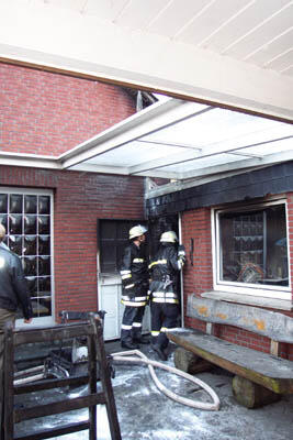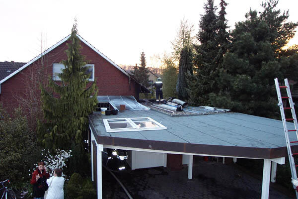 Brand in einem Garagenanbau. Das Feuer drohte auf das Wohnhaus überzugreifen. Anwohner und Nachbarn hatten schon mit Pulverlöschern einen ersten Löschangriff erfolgreich durchgeführt.Durch die Wärmestrahlung schmolzen Kunststoffe im Nebenraum.