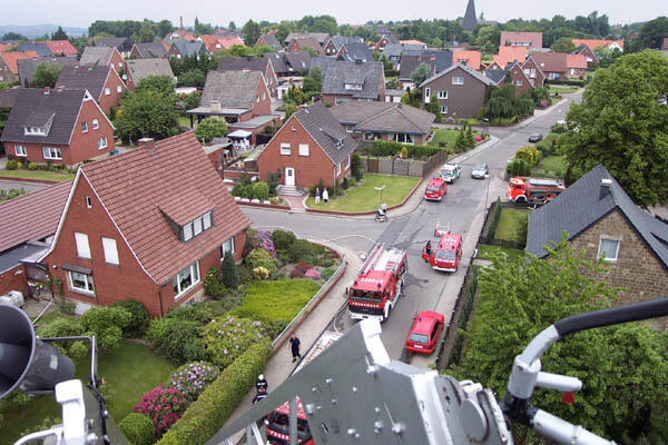 Übersicht vom Korb der DLK 23/12 aus. Der Einsatzort liegt mitten in einer Wohnsiedlung. Die Wasserversorgung war problemlos (80er Unterflurhydrant). Maximal waren 6 C-Rohre im Einsatz - es wurde aber sehr sparsam mit Wasser umgegangen, um die Neben - und Unterwohnungen nicht noch durch Wasserschaden unbrauchbar zu machen.