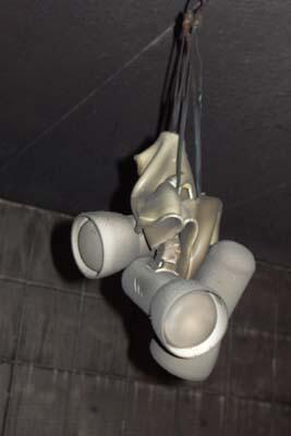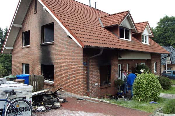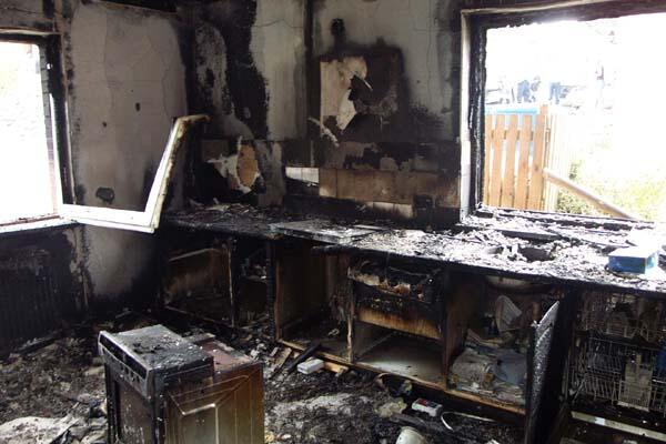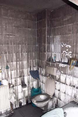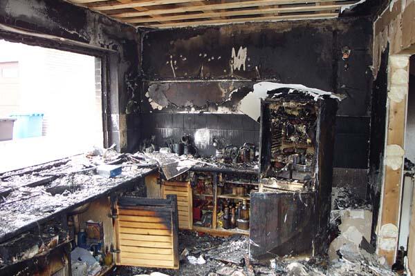 In Abwesenheit der Bewohner wurde diese Doppelhaushälfte durch einen Küchenbrand unbewohnbar. Die Küche selbst (im Erdgeschoss) wurde durch das Feuer vollständig zerstört, die restlichen Räume durch Rauch und Ruß in Mitleidenschaft gezogen.Durch die Wärmestrahlung schmolz u.a. diese Kunststofflampe - im Obergeschoss!