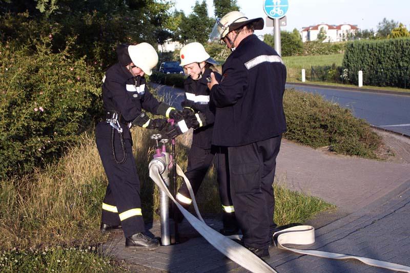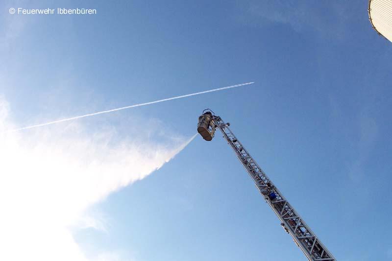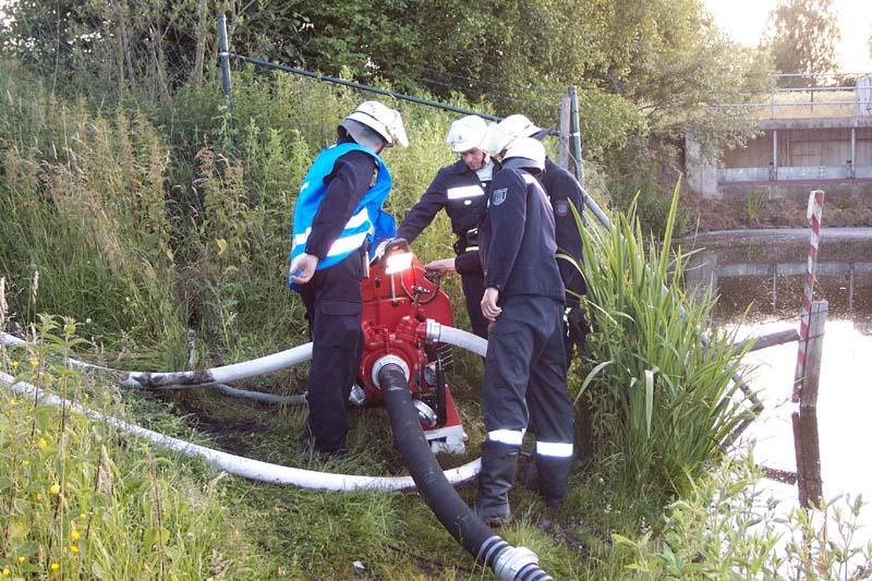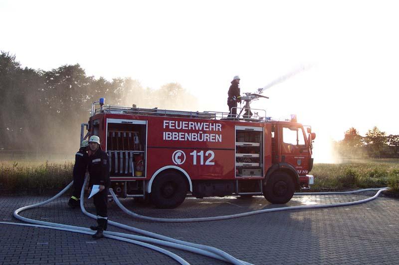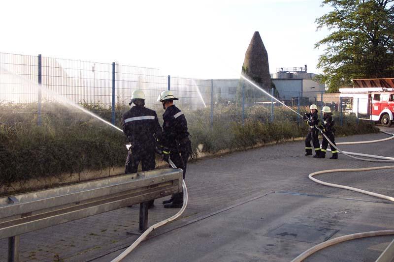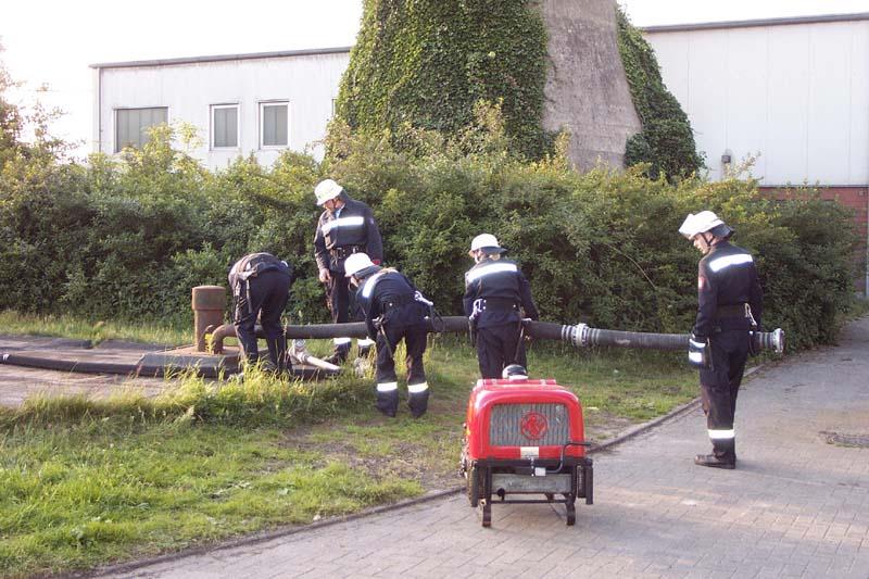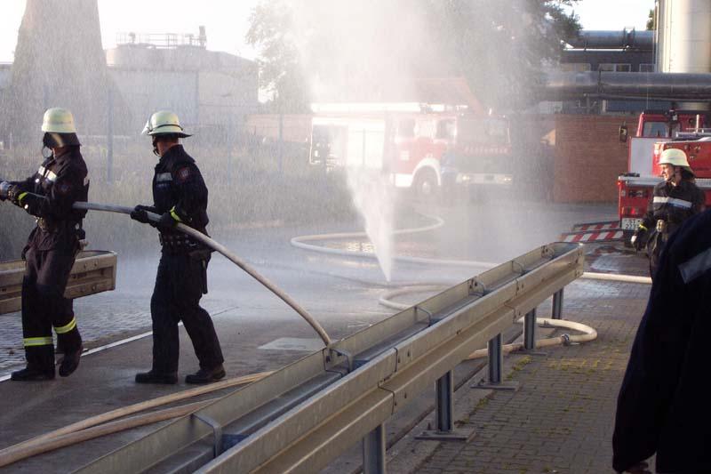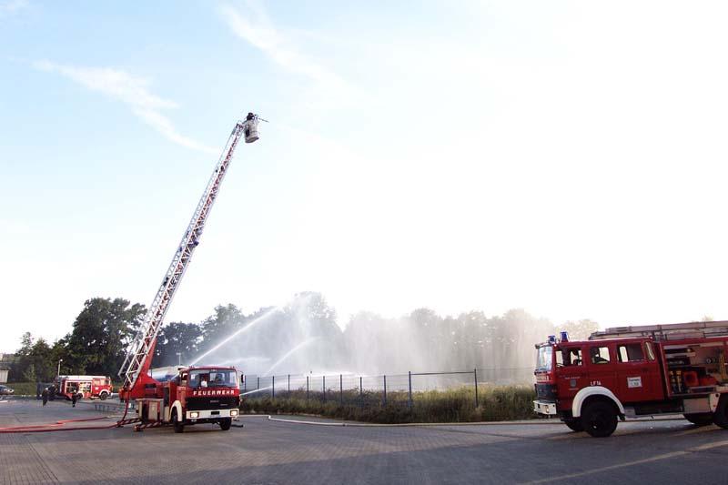 Auf dem Gelände der Fa. Crespel & Deiters sollte vorrangig die Vornahme sämtlicher Pumpen geübt werden. Die Wasserförderung erfolgte sowohl von Unter- und Überfluhrhydranten als auch über lange Wegstrecke von einem offenen Regenrückhaltebecken. Auch der werkseigene Wasserbehälter wurde "angezapft". Gerade junge Maschinisten und auch unerfahrene Strahlrohrführer hatten hier eine gute Gelegenheit alle in der Theorie gelernte Handgriffe in der Praxis zu testen. Die Übungsleitung konnte sich ein Bild von der Ergiebigkleit der Löschwasserversorgung machen.Eindrucksvoll konnte aus allen Rohren "Wasser marsch!" gegeben werden.