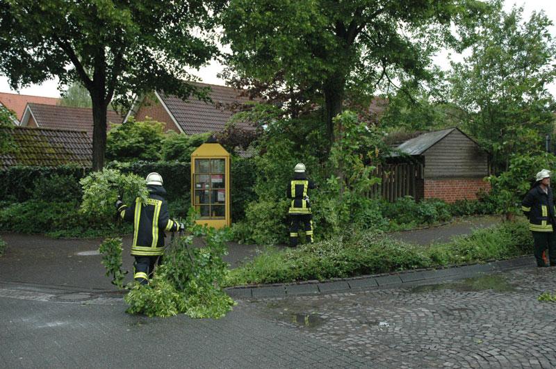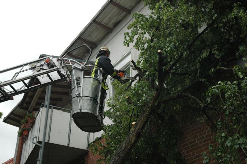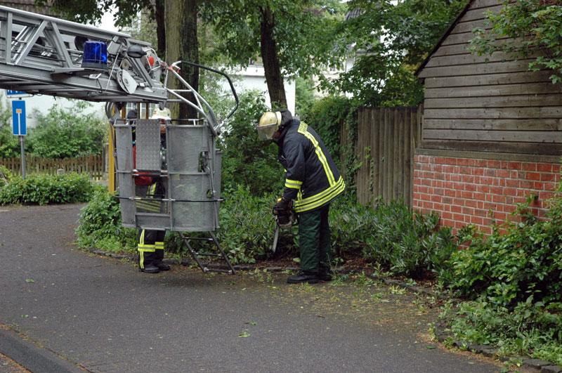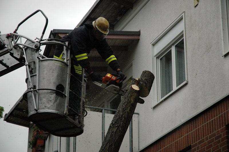 Da der Baum nicht von unten gefällt werden konnte, wurde die Drehleiter mit Korb in Stellung gebracht und vom Bauhof ein Fahrzeug mit Kran und Baumzange nachgefordert.