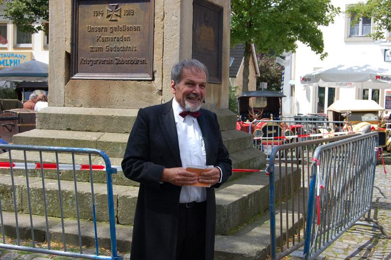 Auch die Moderation wird durch die Feuerwehr unterstützt. Die am Rathaus ankommenden "Schnauferl" werden per Funk in der passenden Reihenfolge an den ELW am Kirchplatz gemeldet und von dort aus werden dem Moderator Bernd-Udo Seiffarth die entsprechenden Informationskarten der Fahrzeuge per Melder überbracht.