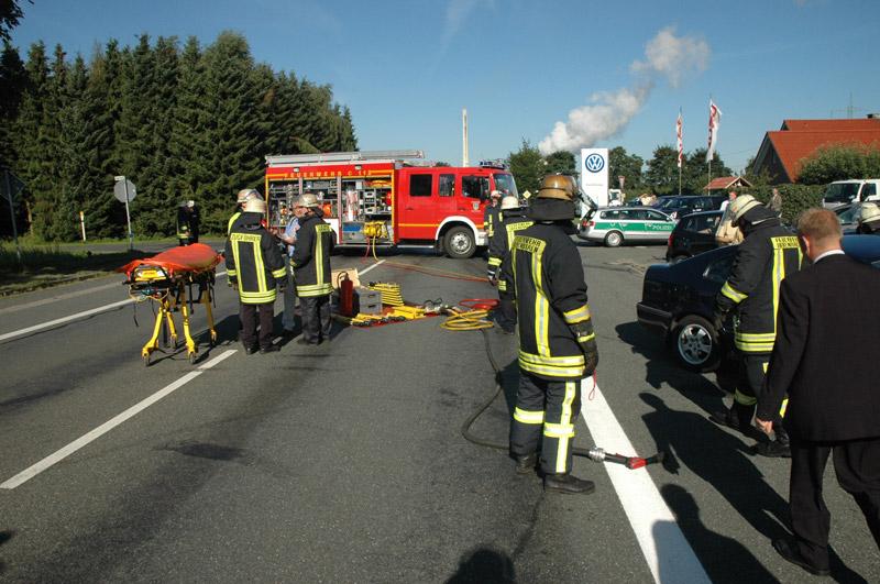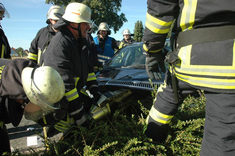 Gemeldet war ein Verkehrsunfall mit drei Verletzten, davon zwei eingeklemmt. Vor Ort stellte sich heraus, dass zwar alle drei verletzt, aber nur eine eingeklemmt war. Diese Person konnte nur mit technischem Gerät (Schere und Spreizer) befreit werden.