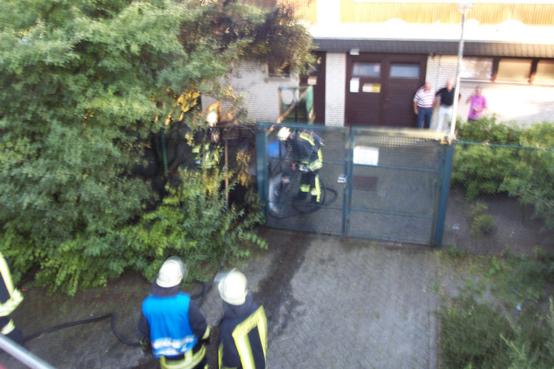 Beim Eintreffen des ersten Fahrzeugs (LF24) stellte sich die Lage wie folgt dar: eine direkt an die Tennishalle angrenzende Grill- und Müllecke war vollends in Brand geraten und erste Löschversuche mit Gardena-Löschgerät durch anwesende Clubmitglieder wurden durch den starken Rauch behindert.