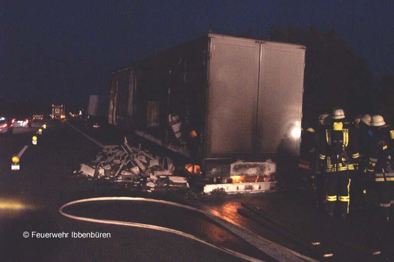 Zu einem Lkw-Brand wurde die Feuerwehr am Mittwochmorgen, gegen 6.30 Uhr alarmiert. Ausgelöst durch einen Reifenbrand hatte der Auflieger eines mit Steinplatten beladenen Sattzelzuges Feuer gefangen. Bei Eintreffen der ersten Kräfte (TLF 24/50) brannte der Auflieger im hinteren Bereich in voller Ausdehnung. Die Zugmaschine konnte der Fahrer zum Glück rechtzeitig abkuppeln und aus dem Gefahrenbereich heraus bringen.Mit 2 C-Rohren wurde der Brand von Trupps unter PA gelöscht. Die Beladung bestand nur aus Steinplatten, so dass keine Umweltgefährdung bestand. Personen kamen nicht zu Schaden. Einsatzdauer inkl. Wiederbestücken der Fahrzeuge mit Schläuchen und Pressluftatmern: etwa 2 Stunden. Eingesetzt waren: TLF 24/50, LF 16/12, LF 16, RW1, ELF und 1 RTW.