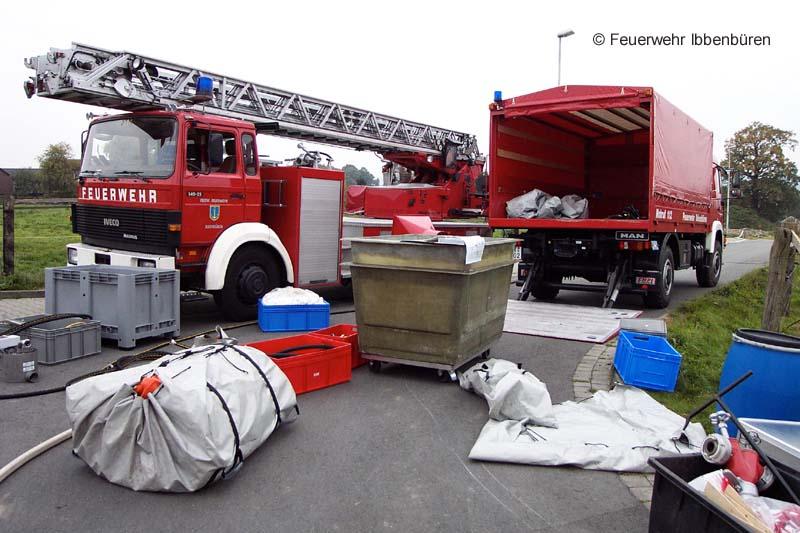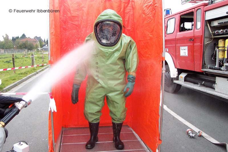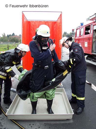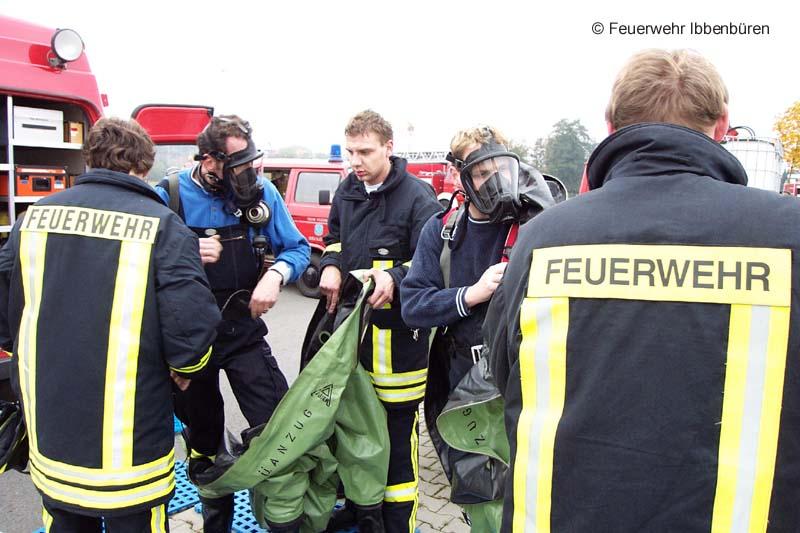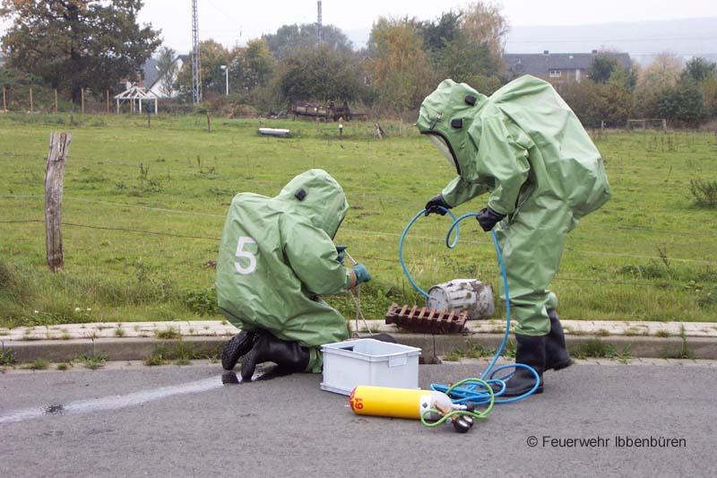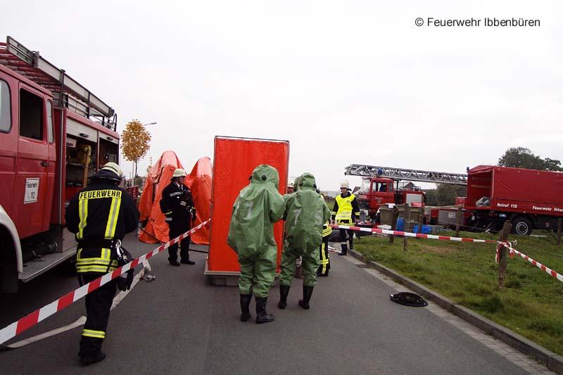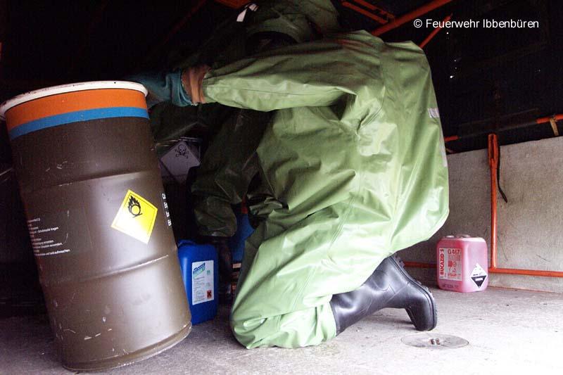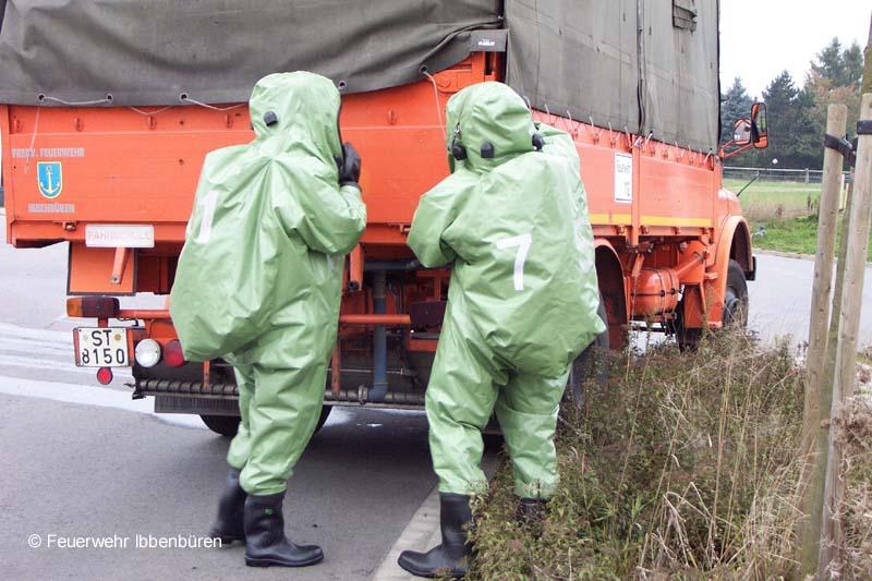 Eine nach Unfall leck geschlagene Stückgutbeladung war Ziel einer GSG-Übung am Samstag in Ibbenbüren. Das feuerwehreigene DMF musste als Übungsfahrzeug herhalten und wurde entsprechend mit Übungsstoffen beladen.Das Vorgehen der Kräfte erfolgte unter Vollschutz mit Chemikalienschutzanzügen. Nach der Rettung einer frei liegenden Person im Gefahrenbereich wurde die Ladung überprüft und bestimmt, die Kanalisation abgedichtet und weitere Sicherungsmaßnahmen durchgeführt.