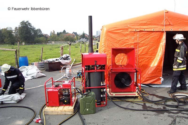 Mit einem mobilen Ölofen wird eine Netzunabhängige Warmwasserversorgung sichergestellt. Mittels Lüfter wird Warmluft in die Zelte geblasen (wer duscht schon gerne kalt und: man stelle sich einen Dekon-Einsatz bei Minusgraden vor...)