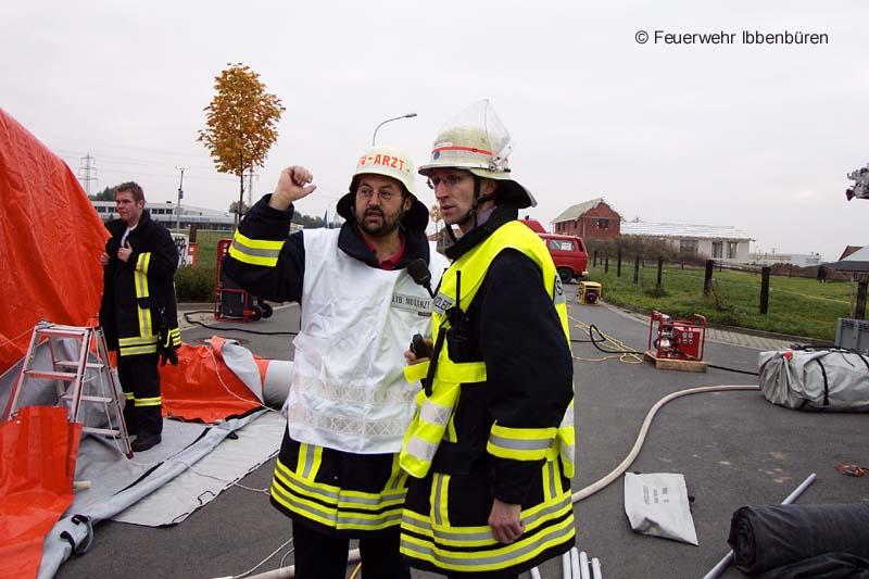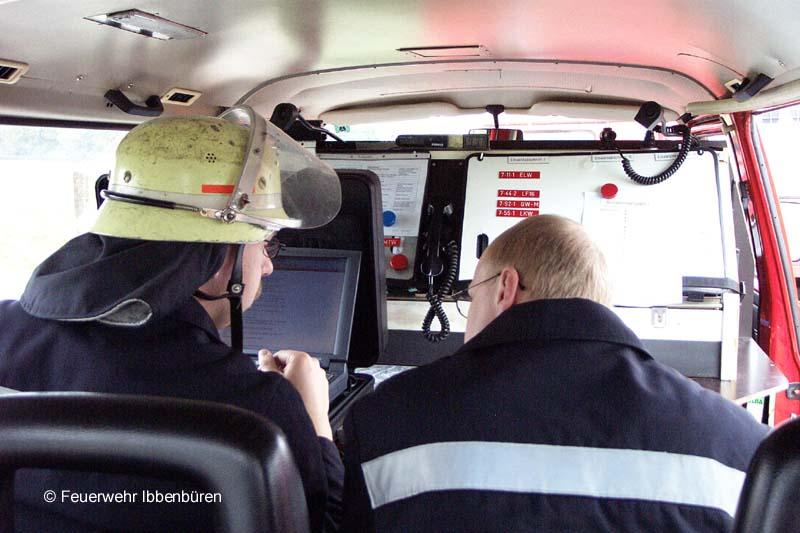 Der völlig unzureichende ELW machte die Arbeit bei der Stoffermittlung und taktischen Einsatzbesprechung nicht wirklich einfacher. Hard- und Softwareprobleme ließen zudem klar die Vorteile von gedruckten Nachschlagewerken erkennen. Rechts: der Feuerwehrarzt der Feuerwehr Ibbenbüren, Dr. Micke, und Übungsleiter BOI Andreas Falkenreck bei einer Lagebesprechung. Die allgemeine Manöverkritik nach Übungsende zeigte Probleme, ließ aber auch ausreichend Positives erkennen. Eine Nachbereitung der Übung auf Führungsebene wird voraussichtlich am kommenden Dienstabend stattfinden.