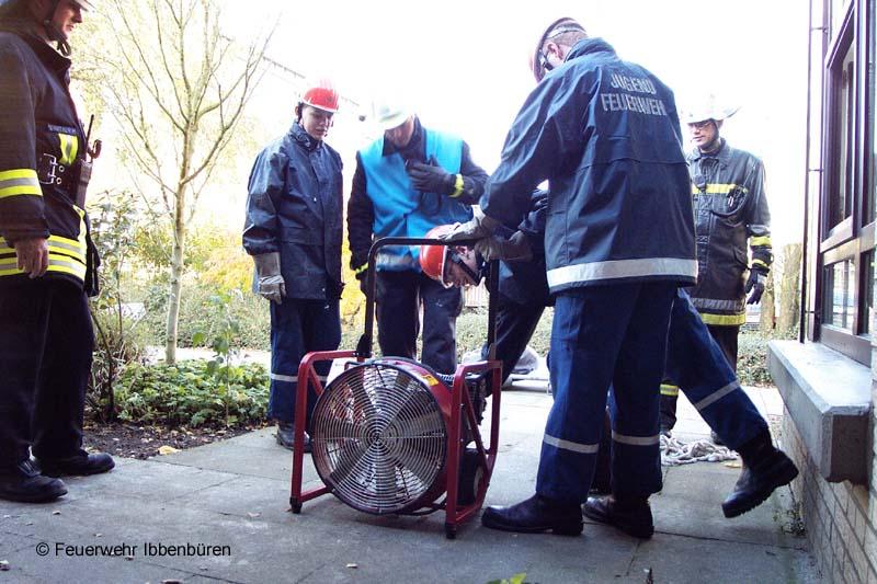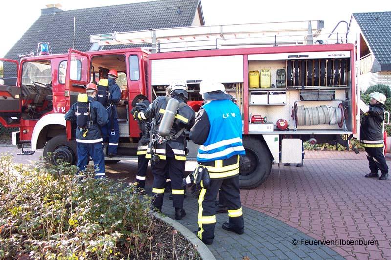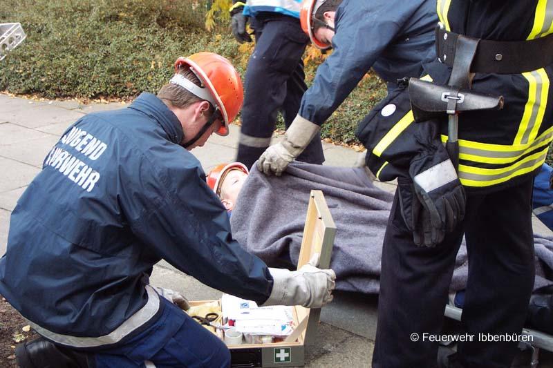 Am Samstag dem 11. November war es mal wieder soweit: Die diesjährige Herbstabschlussübung der Jugendfeuerwehr stand auf dem Programm. Die Vorbereitungen waren abgeschlossen und die Mannschaft angetreten. Die Meldung um 14.00 Uhr lautete: "Brennt Kindergarten St. Michael, mehrere Personen vermisst".LF 16, DLK 23/12, der 7-19-3, das Laggenbecker LF 8/6 und das LF 16 TS aus Rheine rückten mit Kameraden der Löschzüge Stadtmitte 1 und 2, des Löschzuges Laggenbeck, der Feuerwehr Rheine und natürlich der Ibbenbürener Jugendfeuerwehr zum Übungsobjekt aus. Der gesamte Kindergarten war dank unserer Nebelmaschine stark verqualmt und während unter der Leitung der Rheinenser Kameraden die Wasserversorgung aufgebaut wurde, hatten die ersten Angriffstrupps schon alle Hände voll damit zu tun, die sieben Vermissten zu finden und zu retten.