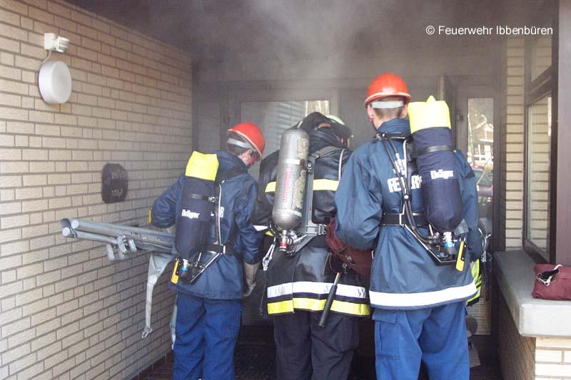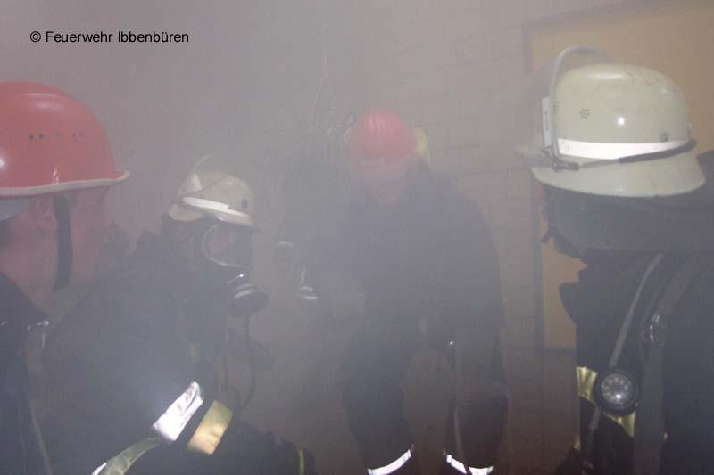 Insgesamt waren bis zu sechs Angriffstrupps im Gebäude, wobei die Jugendfeuerwehrtrupps immer von erfahrenen Kameraden der aktiven Wehr begleitet wurden. Die Rettung der vermissten Personen, die übrigens durch Kameraden der Jugendfeuerwehr Rheine gestellt wurden, verlief reibungslos und so konnten an der Verletztensammelstelle bald sieben gerettete Personen gemeldet werden.