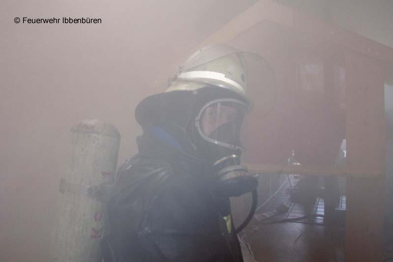 Nach dem massiven Löschangriff, der durch das Wenderohr der Drehleiter unterstützt wurde, konnte nach reichhaltiger Belüftung der Örtlichkeit, bald "zum Abmarsch fertig" geblasen werden. Nach ca. zwei Stunden waren alle eingesetzten Kräfte zurück an der Wache am Püsselbürener Damm und konnten sich zur Übungsnachbesprechung im Haus Köster einfinden.