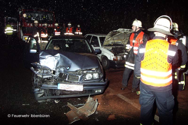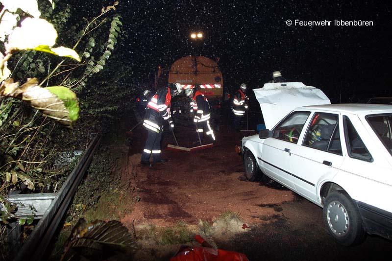 Zu einem Verkehrsunfall auf der A 30 wurde die Freiwillige Feuerwehr Ibbenbüren am Montagmorgen, gegen 6.20 Uhr alarmiert.Die eingesetzten Rettungskräfte hatten die Feuerwehr nachgefordert, da Betriebsstoffe ausliefen. Personen waren nicht mehr zu befreien. Mit einem LF16/12, RW1 und dem SW2000 als Zugfahrzeug für den "Anhänger Öl" sowie einem ELW und MTW waren schnell ausreichend Kräfte vor Ort.