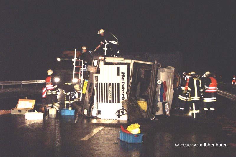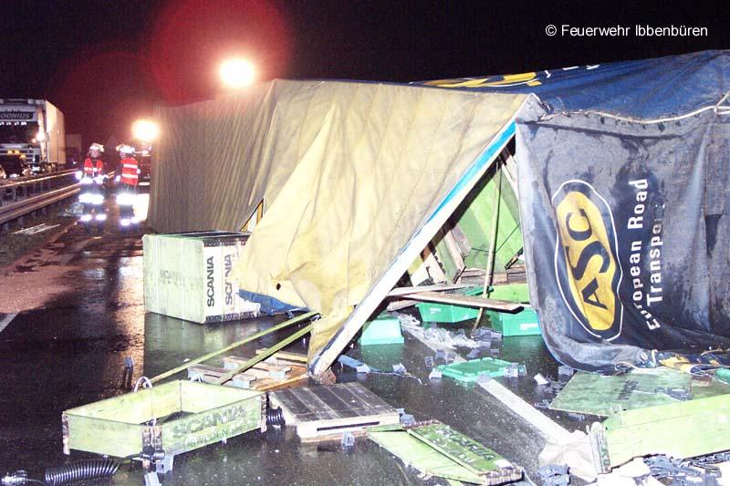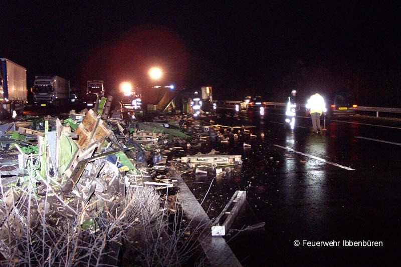 Zu einer technischen Hilfeleistung wurde die Freiwillige Feuerwehr Ibbenbüren am Donnerstag, gegen 5.50 Uhr alarmiert. Schon gegen 5 Uhr hatten sich zunächst ein Lkw-Unfall und infolgedessen zwei weitere Unfälle ereignet:Ein Sattelschlepper (aus Richtung Holland) war außer Kontrolle geraten und gegen die Mittelleitplanke geprallt. Das Fahrzeug kippte um und verlor seine Ladung (Rohgussteile) auf die Gegenfahrbahn. Dort überfuhren vier Sattelschlepper, die in Richtung Holland unterwegs waren, die Teile und schnitten sich die Reifen und mehrere Leitungen auf. Ein weiterer Kleinlastwagen geriet bei dem Versuch, den Teilen auszuweichen, ebenfalls außer Kontrolle und schleuderte gegen die Mittelleitplanke. Diesem Kleinlaster konnte dann ein Pkw-Fahrer nicht mehr ausweichen. Insgesamt wurden 4 Personen verletzt.