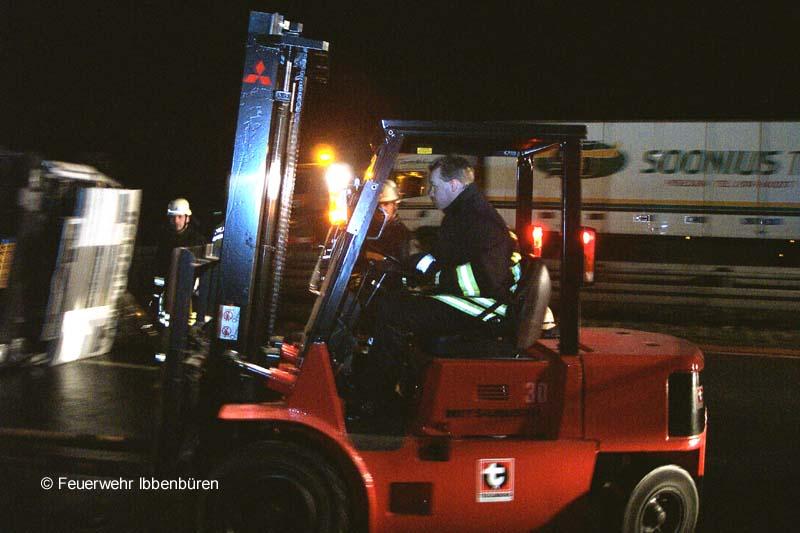 Der Löschzug musste ausrücken, weil der 500-Liter-Dieseltank des verunglückten Sattelschleppers gerissen war. Ausgelaufener Dieselkraftstoff wurde abgestreut und aufgenommen. Der Tank wurde mit Unterstützung des feuerwehreigenen Gabelstaplers abmontiert und so gelagert, dass kein weiterer Kraftstoff austreten konnte. Einige Liter, die in einen angrenzenden Bach gelangt waren, wurden mit Bindemittel eingegrenzt, nachdem der Bachlauf gestaut und Ölsperren gesetzt worden waren. Etwa die Hälfte der eingesetzten Kräfte musste gegen 8.10 Uhr kurzzeitig die Einsatzstelle verlassen, um bei dem Verkehrsunfall in Uffeln (siehe nächster Bericht) tätig zu werden.