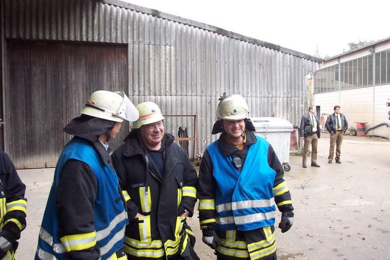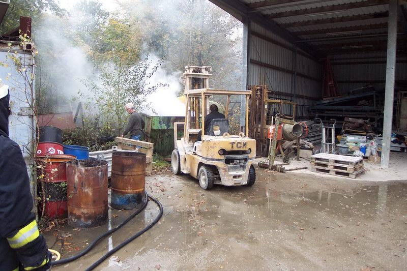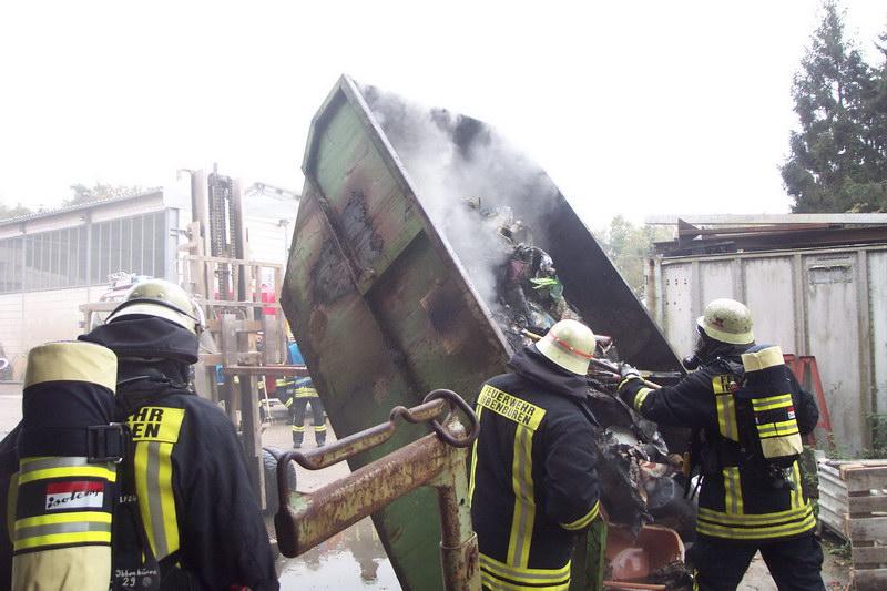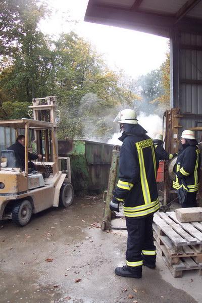 Da der Container schon recht gut gefüllt war, wurde er mittels einem vor Ort vorhanden Gabelstapler aufgerichtet und durch die Feuerwehrkräfte entladen. So konnte das nun zugängliche Brandgut mittels Dunghacken auseinander gezogen und vernünftig gelöscht werden.