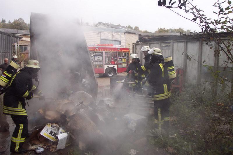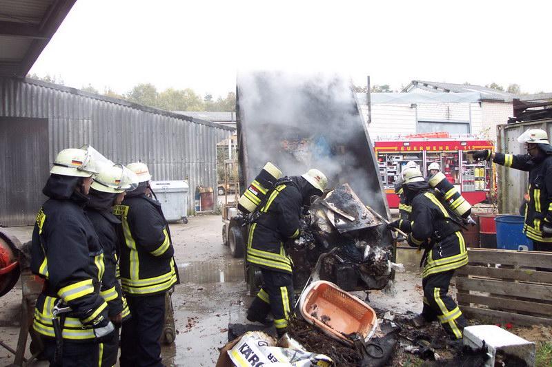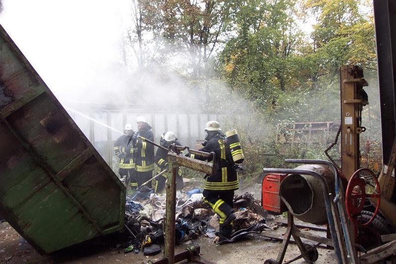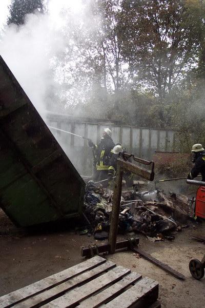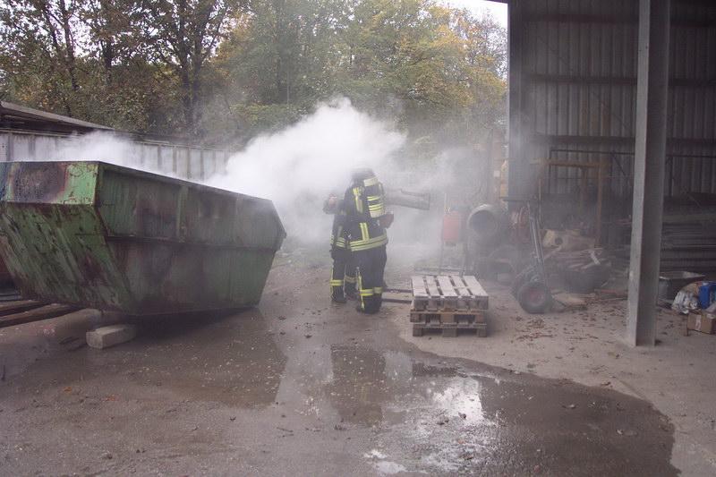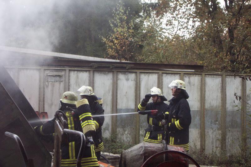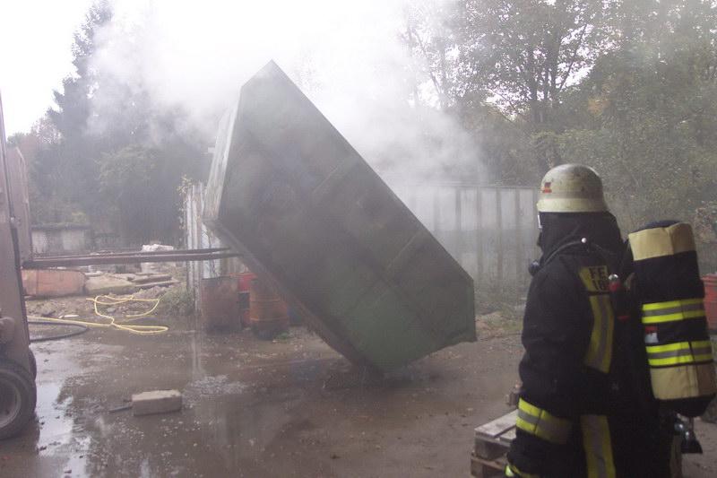 Die ersteintreffenden Kräfte des LF24 fanden dort einen brennenden Container an einer Halle vor. Der Firmeninhaber selbst hatte schon mit dem handelsüblichen „Gardena- Gartenlöschgerät“ den Versuch eingeleitet das Feuer zu löschen.