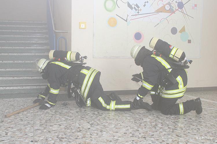 Nach der ersten Lagefeststellung der Einsatzleitung ergaben sich die beiden Hauptgefahren die es direkt abzuarbeiten gab. Einmal die Menschenrettung der Schulklasse im zweiten OG und zweitens die Personensuche im Keller mit anschließender Brandbekämpfung.