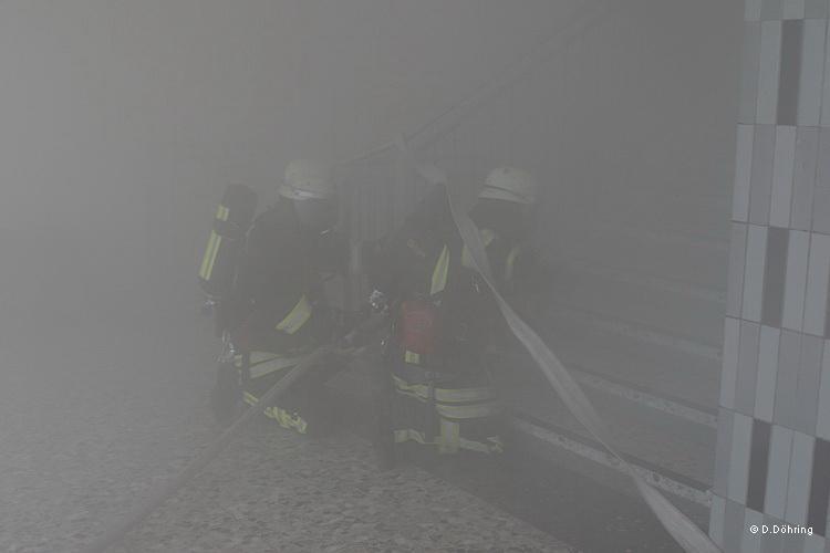 Die Personensuche und Brandbekämpfung stellte sich als schwierig dar, da die recht starke Verrauchung des Gebäudes (der Nebelmaschine sei Dank) sowie der Abdunkelung der Atemschutzmasken (Dank auch an Olaf und Markus) das Vorankommen doch ein wenig gebremst wurde.