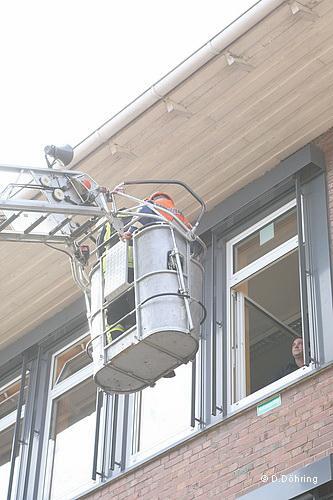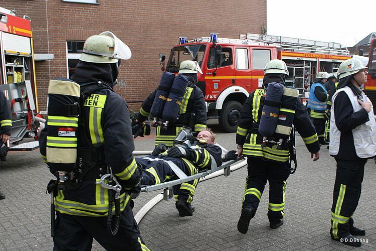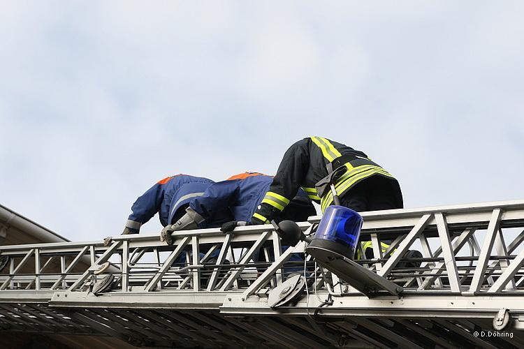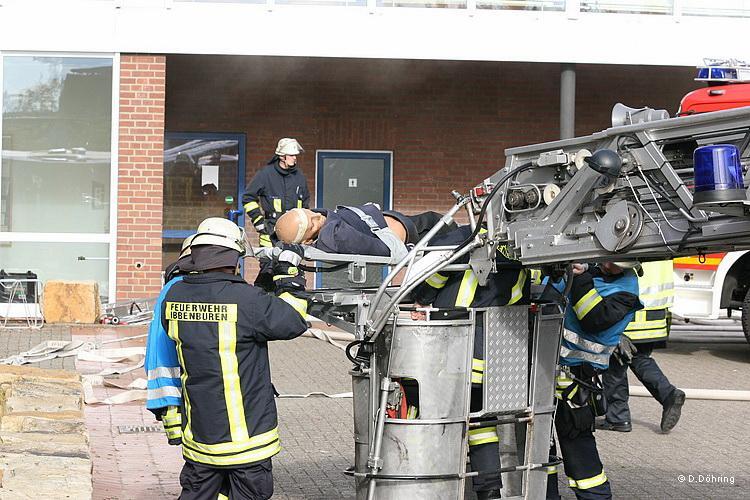 Die Rettung der 14 Schüler, dargestellt durch die Jugendfeuerwehr, deren Lehrer und einer bewusstlose Person (Übungspuppe), wurde mittels der DLK 23/12 schnellstmöglich eingeleitet. Die Rettungsmaßnahmen zeigten den relativ hohen Zeitaufwand, den man auch für die Rettung über die Drehleiter benötigt.