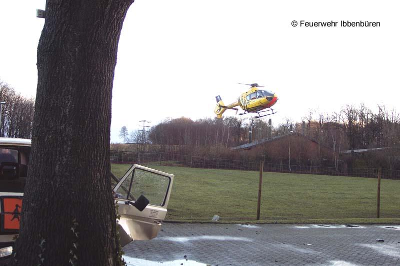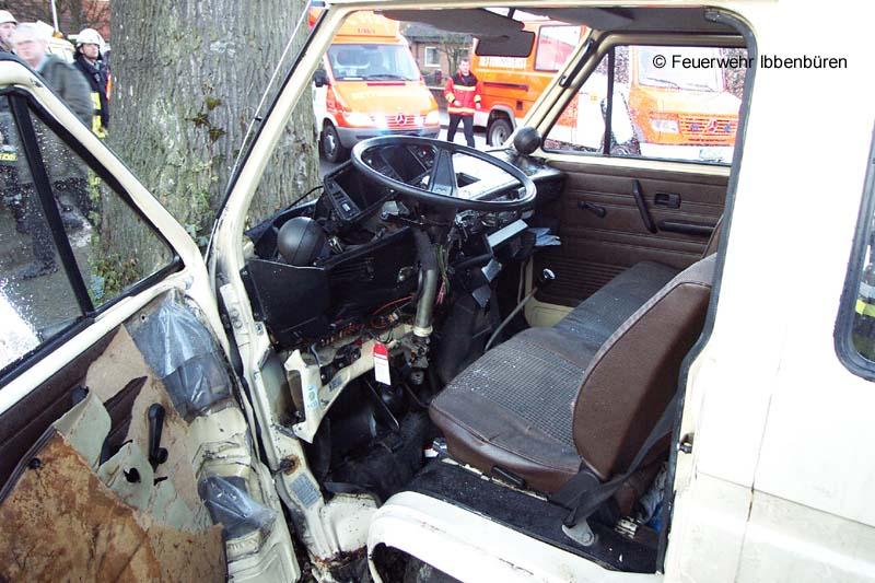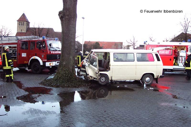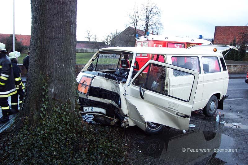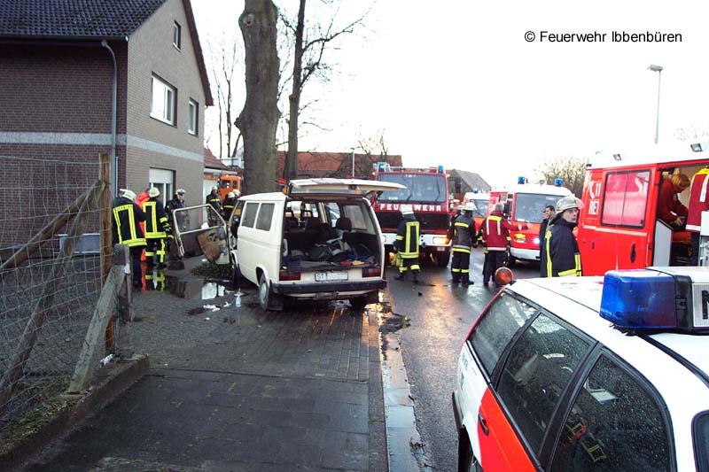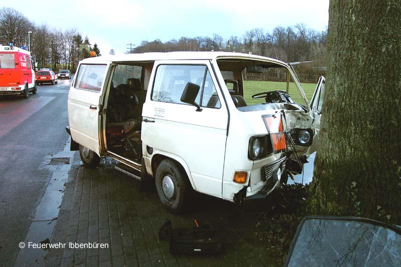 Zu einem Verkehrsunfall wurde die Freiwillige Feuerwehr Ibbenbüren am Donnerstag, gegen 8.10 Uhr alarmiert. Ein Kleinbus war im Ortsteil Uffeln aus bislang ungeklärter Ursache von der Straße abgekommen und frontal vor einen Baum gefahren. An Bord befanden sich der 62-jährige Fahrer, eine 66-jährige Begleiterin sowie 6 Schulkinder im Alter von 10 bis 14 Jahren.Die Feuerwehr war zu der Zeit mit einem Löschzug bereits unterwegs bzw. bei einem vorangegangen Einsatz frei (Öl aufnehmen nach nächtlichem VU auf der BAB 30 - Bericht folgt). Weitere hauptamtliche und freiwillige Kräfte kamen über FME alarmiert nach.