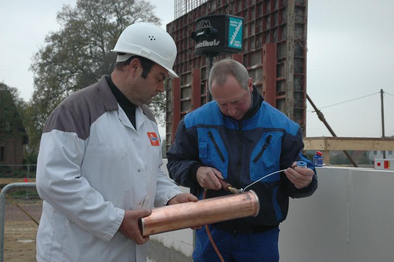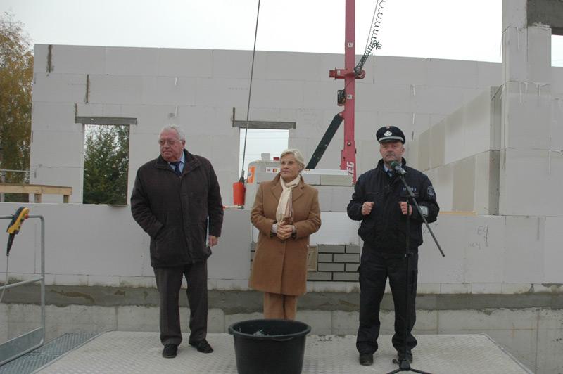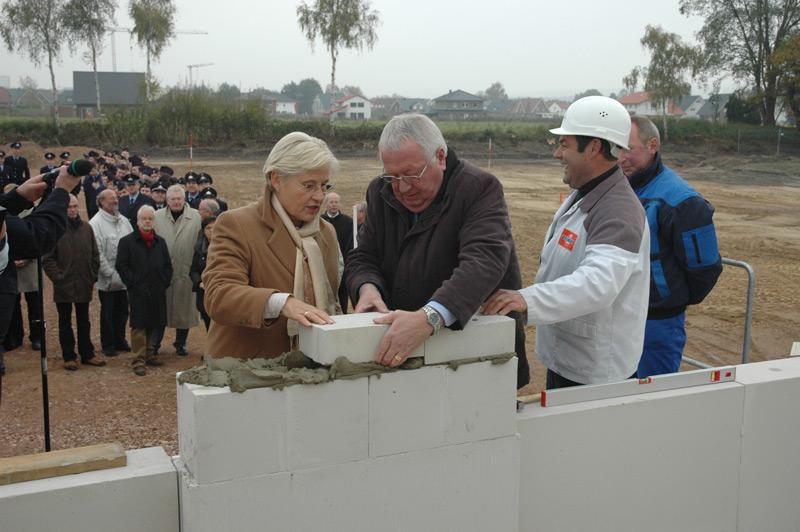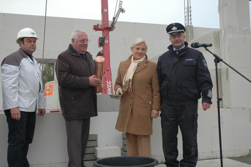 Zur eigentlichen Grundsteinlegung traten dann der Bürgermeister, die stellv. Landrätin und der Leiter der Feuerwehr Heiner Löpmeier, zusammen mit Hans-Hermann Busch, Polier der Firma Ostendorf, an.