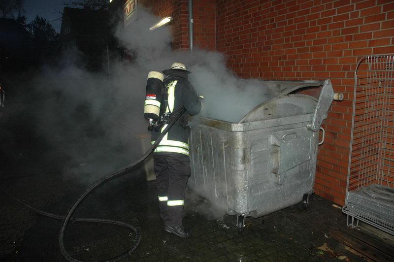 Ein an der Gebäudefassade stehender Restmüllcontainer eines Verbrauchermarktes brannte und wurde von einem Trupp unter schwerem Atemschutz mit dem Schnellangriff des LF24 abgelöscht.