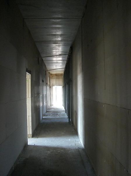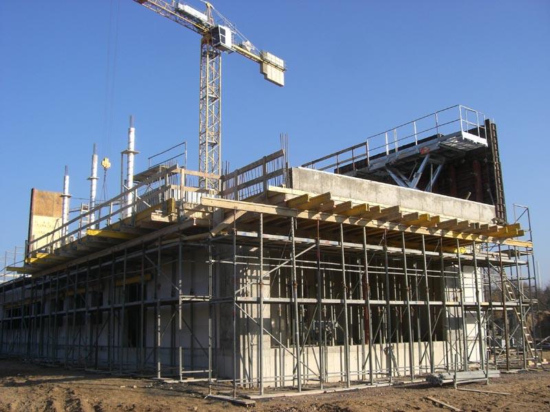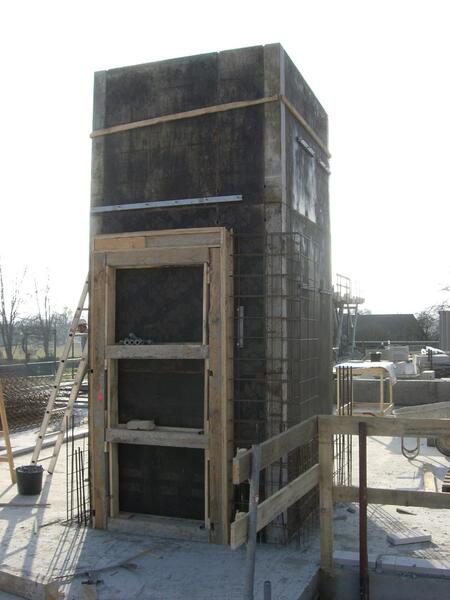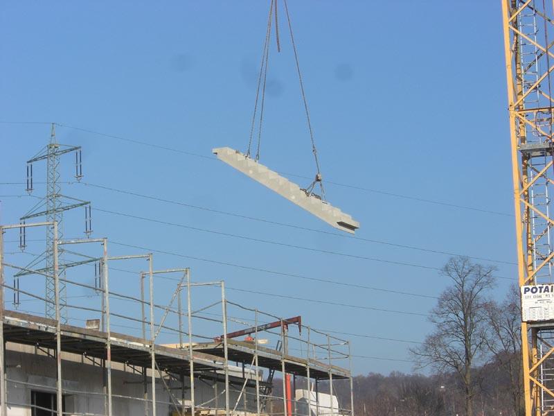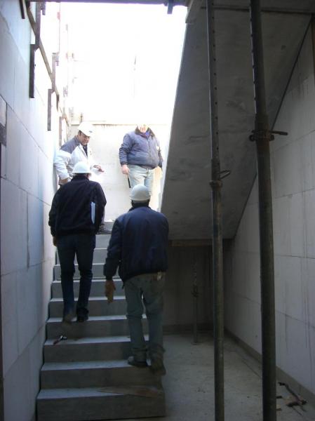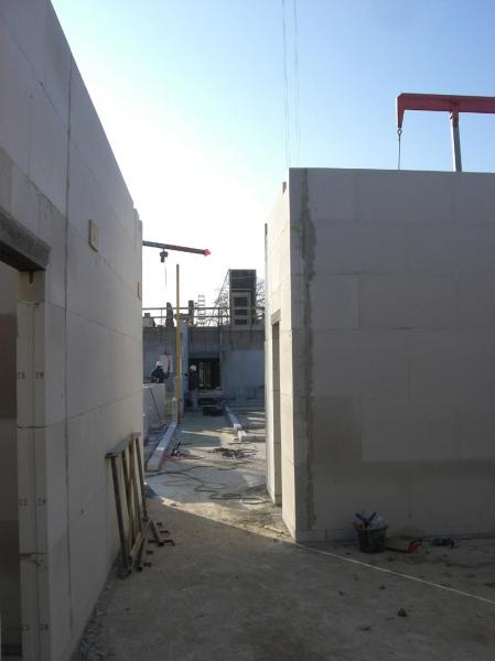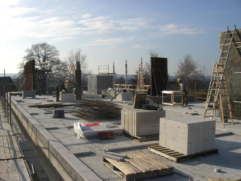 Im südlichen Bauabschnitt ist die erste Steinreihe (Kimmschicht) im ersten Obergeschoss schon gelegt, die Einschalungen diverser Betonmauern sind im Gange und die erste Treppe ist fertig.