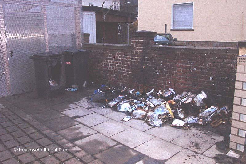 Gegen 2.30 Uhr wurde die Feuerwehr Ibbenbüren zu einem Brand in der Tiefgarage eines 24(!)-Familien-Hauses in der Brunnenstraße alarmiert. Dort brannten mehrere "gelbe Säcke", die von einem Trupp unter PA schnell gelöscht wurden. Auch drang kein Rauch in die darüber liegenden, zahlreichen Wohnungen, so dass der Einsatz zum Glück ohne Personenschaden verlief. Zwei geparkte Pkw wurden vermutlich durch explodierende Spraydosen, die sich in den Säcken befanden, beschädigt.