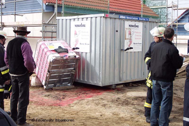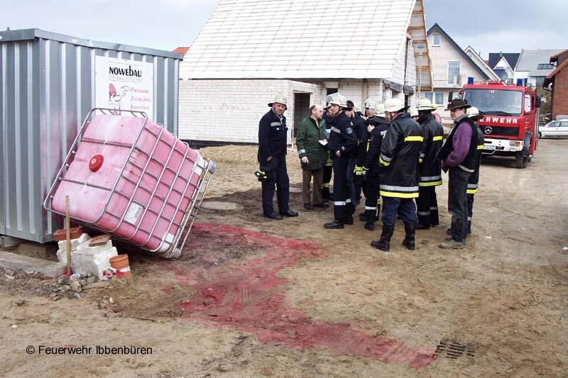 Am Samstagvormittag wurde die Feuerwehr Ibbenbüren zu einem Gefahrguteinsatz in die Neubausiedlung Alstedder Loh gerufen. Aus einem dort abgestellten Kunststofftank war eine unbekannte Menge einer Chemikalie ausgelaufen.Es stellte sich anhand des Gefahrgutzettels heraus, dass es sich bei der Flüssigkeit um mit Wasser verdünnte Weizenbleiche handelt. Dieses Pestizid ist als gesundheitsgefährdend, aber nicht ätzend und nicht brennbar einzustufen. Sie musste auch schon im Laufe der Nacht ausgelaufen sein, da alles bereits im Erdreich versickert bzw. angetrocknet war.