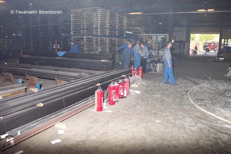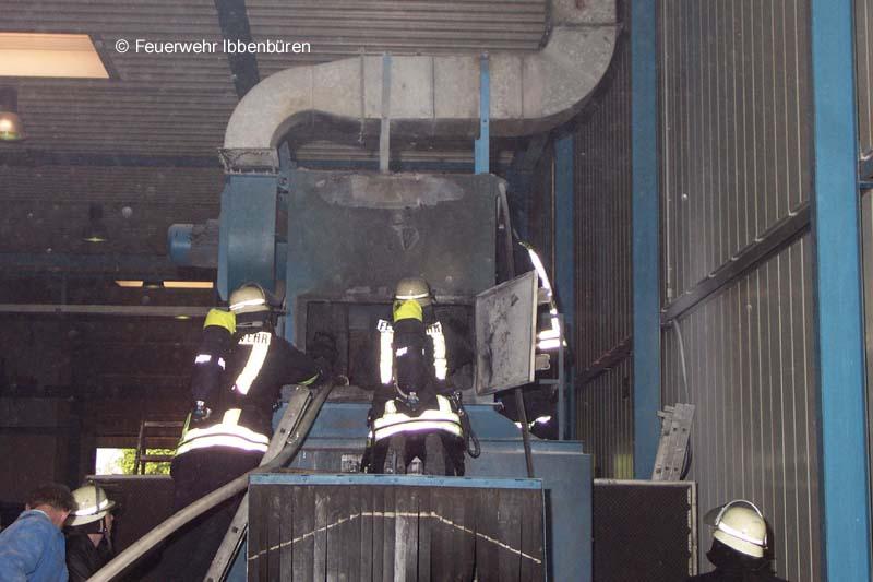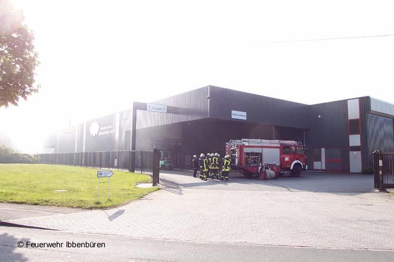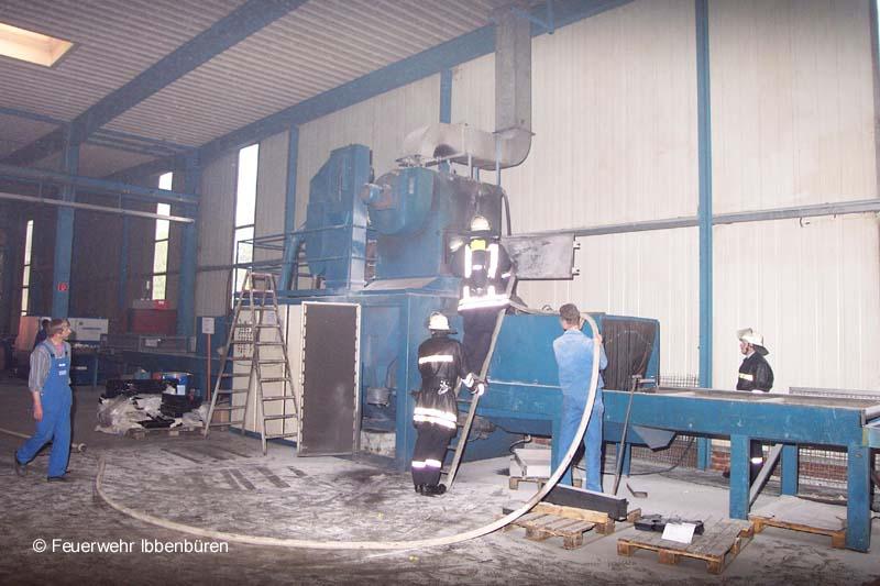 Zu einem Brand in der Metallbaufirma MBH wurde die Freiwillige Feuerwehr Ibbenbüren am Montag, gegen 8.45 Uhr alarmiert. Es brannten Metallspäne bzw.-stäube in der Filteranlage einer Strahlmaschine. Mitarbeiter hatten bis zum Eintreffen bereits mit Pulverlöschern einen Teil des Feuers bekämpft. Zunächst wurde durch einen Trupp unter PA mittels C-Rohr vorgegangen. Nach dem Belüften der Halle konnte zum Teil ohne Atemschutz weiter an der Strahlanlage gearbeitet werden.Es wurden Filterteile aus der Anlage entfernt und im Freien abgelöscht. Im weiteren Verlauf musste jedoch ein Großteil der Anlage demontiert werden, ehe dann nach gut zwei Stunden der Einsatz beendet war.