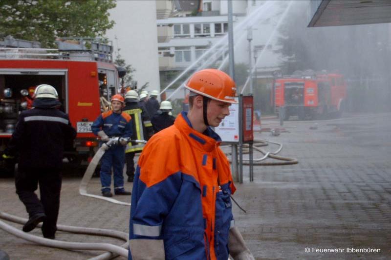Ein Teil der JF Ibbenbüren kümmerte sich gemeinsam mit einem LF 16/12 der Feuerwehr Ratingen und zwei Hopstener Kameraden um einen Verkehrsunfall, bei dem eine Person eingeklemmt war und aus ihrem Fahrzeug nur noch mit Hilfe der Rettungsschere und des Spreizers zu befreien war. Die weiteren Kameraden der JF Ibbenbüren, Hopsten und Laer waren bei Löscharbeiten am Übungsobjekt voll mit eingebunden.