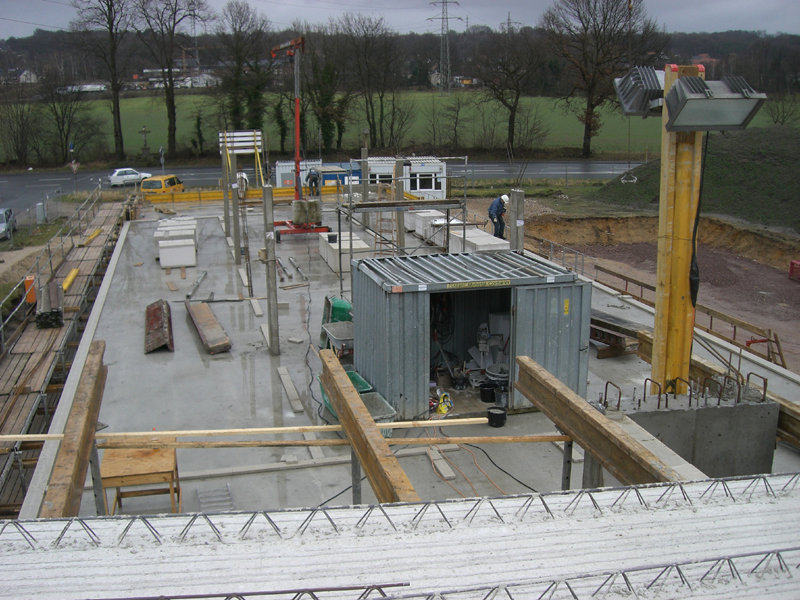 Im nördlichen Abschnitt ist die Geschossdecke der RTW-Halle fertig. Die Kimmschicht der Raumeinteilung im 1. OG ist ebenfalls schon gelegt, sodass in der kommenden Woche mit den Maurerarbeiten begonnen werden kann. "Nebenbei" sind schon fast alle Entwässerungsrohre und Kanalschächte auf dem Gelände eingebracht.