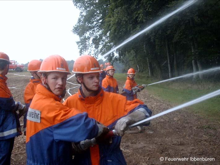 Am Samstag, dem 14. September 2002, war es soweit. Die Kreisjugendfeuerwehr-Alarmübung der Jugendfeu-erwehren im Kreis Steinfurt stand auf dem Programm. Alle 18 Jugendfeuerwehren des Kreises waren eingela-den und erschienen.Die Jugendfeuerwehr Ibbenbüren nahm mit 21 Kameraden und fünf Fahrzeugen teil. Das LF 16 TS für die Wasserversorgung, das TLF 16/25 vom HLZ für die direkte Waldbrandbekämpfung, das DMF als Versorger sowie die DL 30 HLZ und der JF Bulli für den Transport der Einsatzkräfte. Die Übung wurde in diesem Jahr von der Feuerwehr Lotte unter Federführung des örtlichen Jugendwartes Gerd Nüsse geplant und durchgeführt.