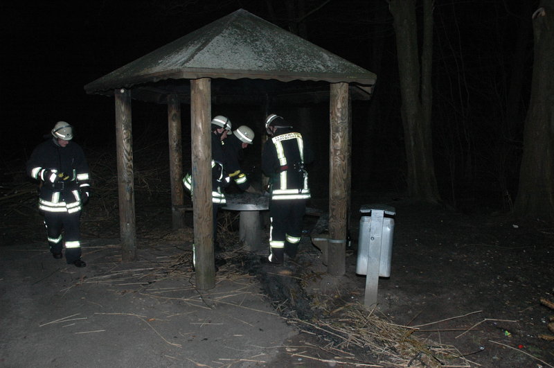 Holzschnitt war im Unterstand angezündet worden und hatte diesen angekokelt. Das Feuer war bei Eintreffen bereits aus. Ablöschen von Glutnestern durch die Mannschaft des LF24 mit Kübelspritze und S-Rohr.