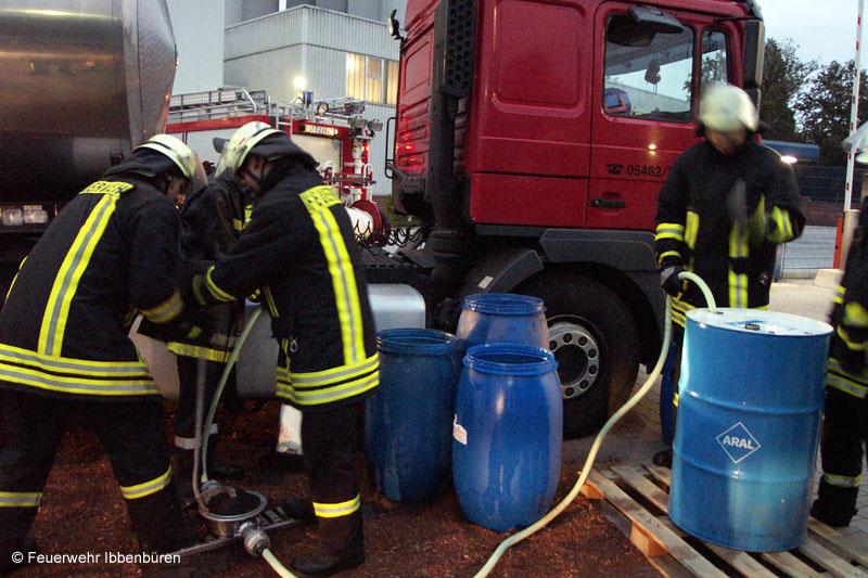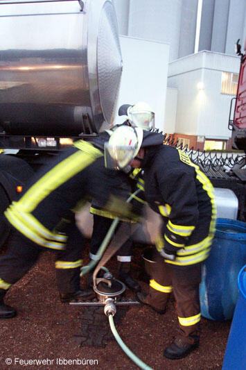 Dann wurde mit der feuerwehreigenen Umfüllpumpe der übrige Kraftstoff in vom Werk bereitgestellte Fässer umgepumpt.