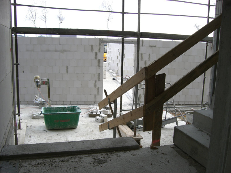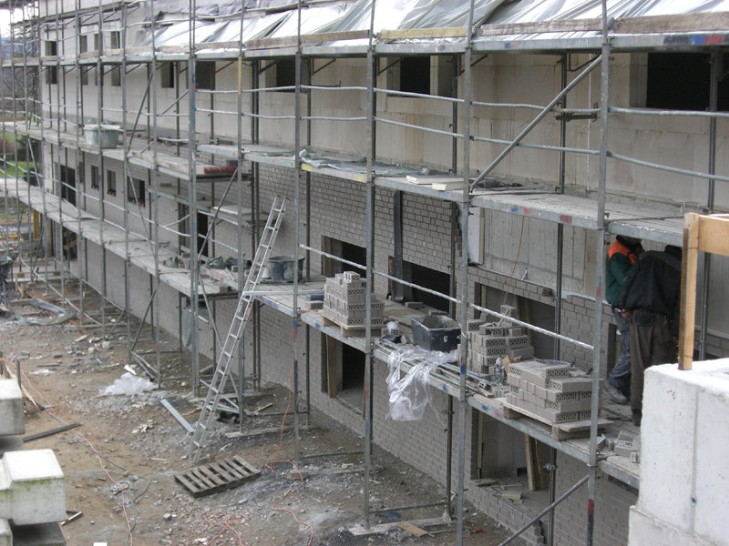 Der Klinkersockel ist fast fertig gemauert. Im zukünftigen Innenhof wird der Klinker allerdings bis zum 1. OG hochgezogen.