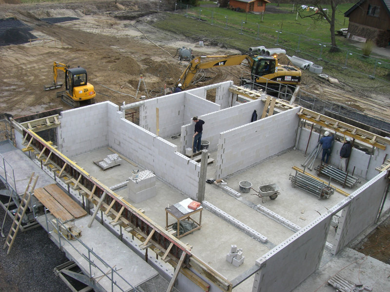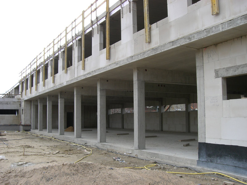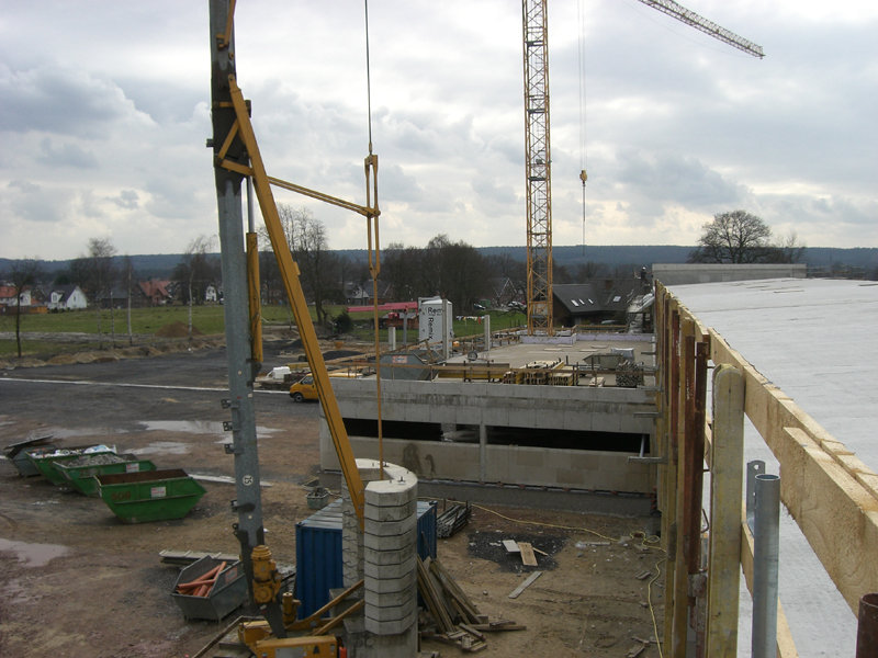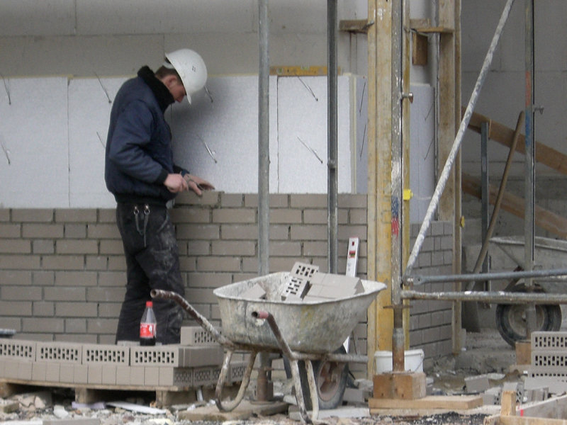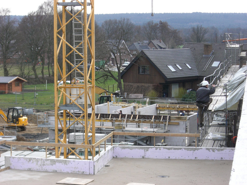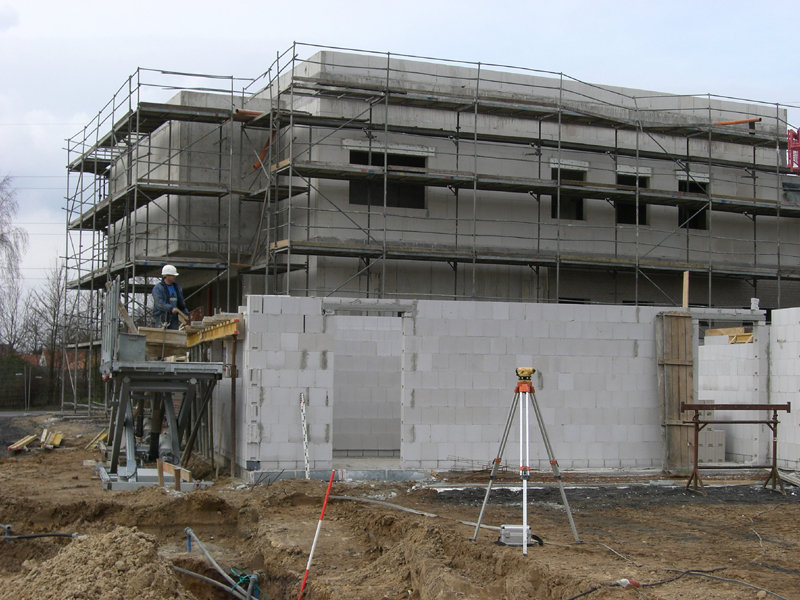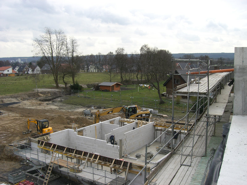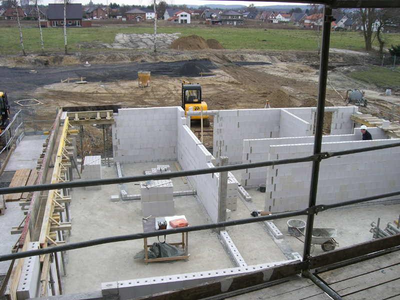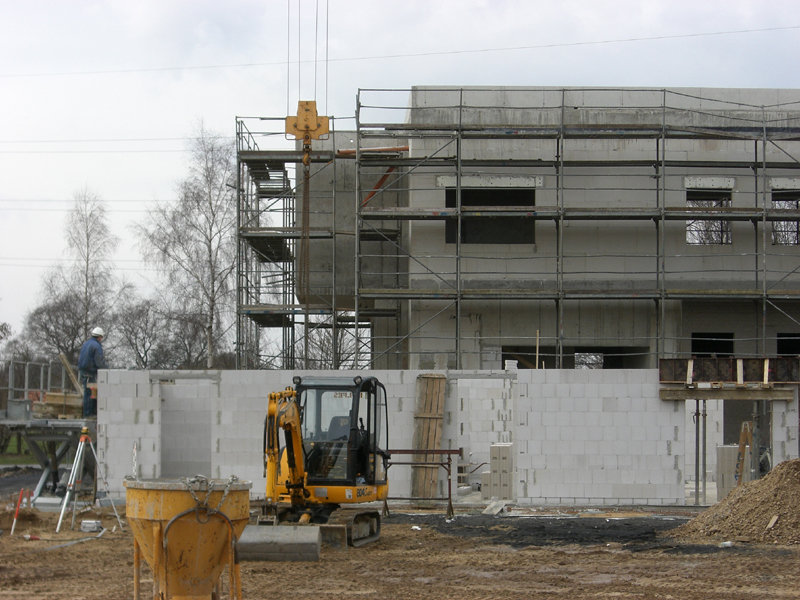 Das Werkstättengebäude ist im Erdgeschoß so gut wie fertig gemauert. Die Betondecke kann in der kommenden Woche aufgelegt werden. Danach wird das Fundament und die Bodenplatte für die anschließende KFZ-Werkstatt, die Waschhalle und das Lager eingebaut.