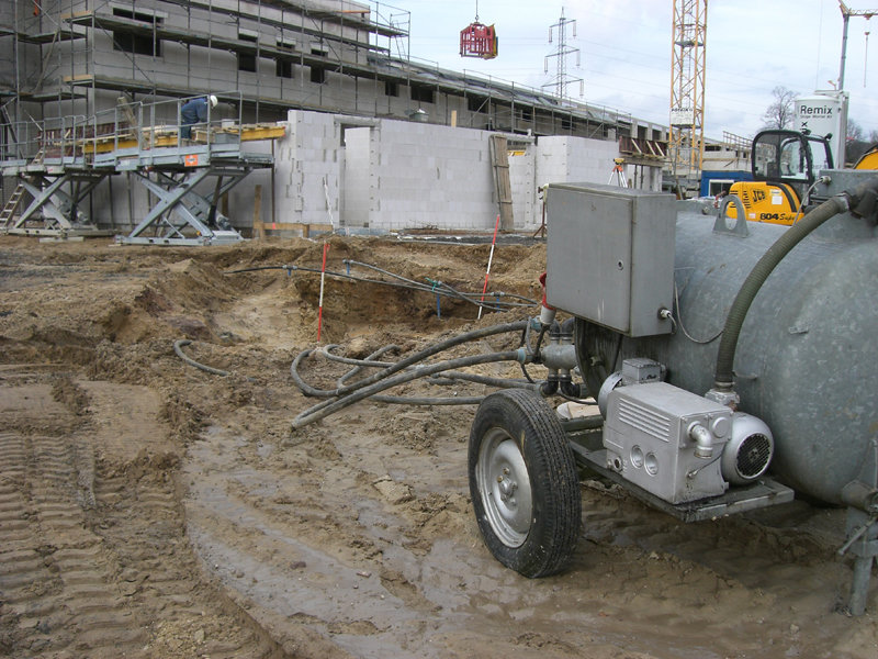 Ebenfalls laufen die Arbeiten am Öl- und Fettabscheider, der im rückwertigen Bereich der Werkstatt ca. 3 Meter in den Erdboden eingebaut wird. Daher auch die Grundwasserabsenkung.